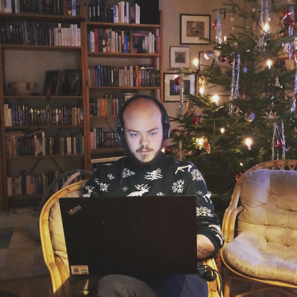 "Hemarbetandes bibliotekarie från Löddeköpinge. På bilden syns Felix Sjögren, bibliotekarie på Löddeköpinge bibliotek. Fotograf är Emmili Sjögren. Tagen den 2020-12-28 och publicerad på bibliotekens instagram.