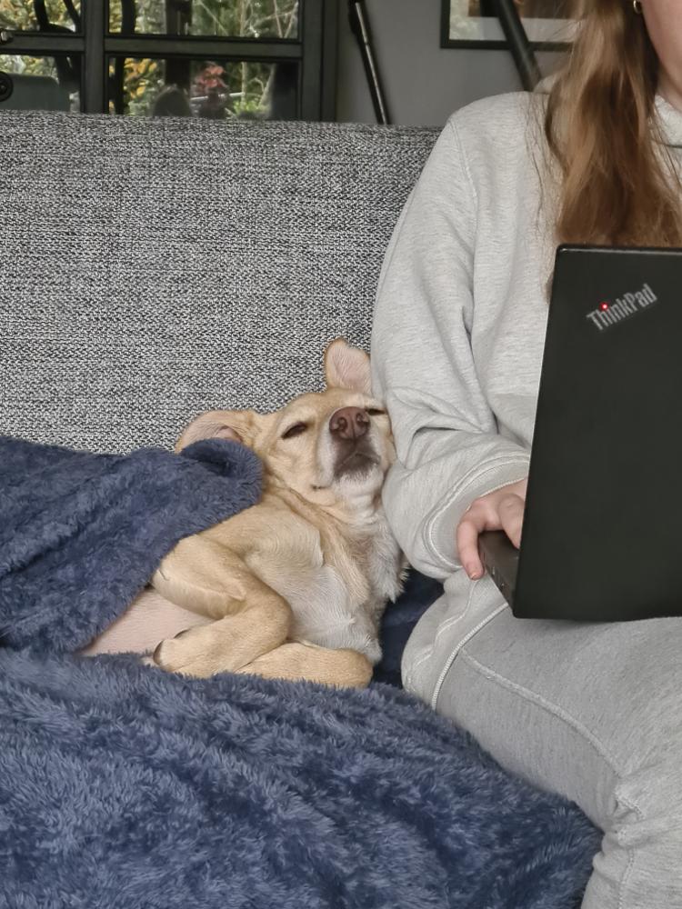 "Jag har tre hundar varav två har fastnat på bild under arbetsdagen. 😊 Inget ont som inte för något gott med sig! Att jobba hemifrån har gett mig en ny vardag, med avsevärt mindre stress. Att slippa transporttider och resor, att kunna gå ur sängen till sitt ”kontor”, att ha effektivare digitala möten och att ha möjligheten att köra både tvätt- och diskmaskin under tiden man jobbar har gett mig mer tid och även mer fritid även om jag arbetar fler timmar. En vinst för både mig och min arbetsgivare. Jag har lärt mig hantera fler digitala verktyg som jag definitivt kommer att fortsätta använda i framtiden. Att jag dessutom kan leka med mina hundar på min kafferast är en bonus! Så för mig har hemmaarbetet definitivt haft fler positiva effekter än negativa, även om det ska bli roligt att få träffa och krama om mina kollegor när vi kan."