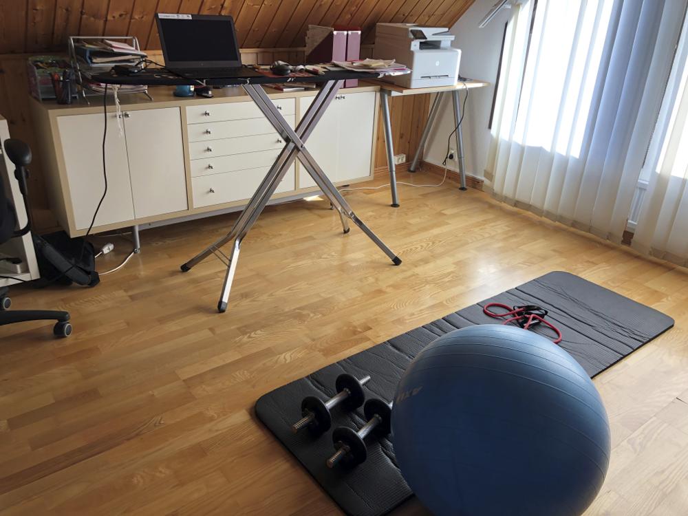pilatesboll; kontor; träningsredskap; dator; corona; arbeta hemma; hantlar; covid-19; arbete; hemmakontor; strykbräda; pandemi
