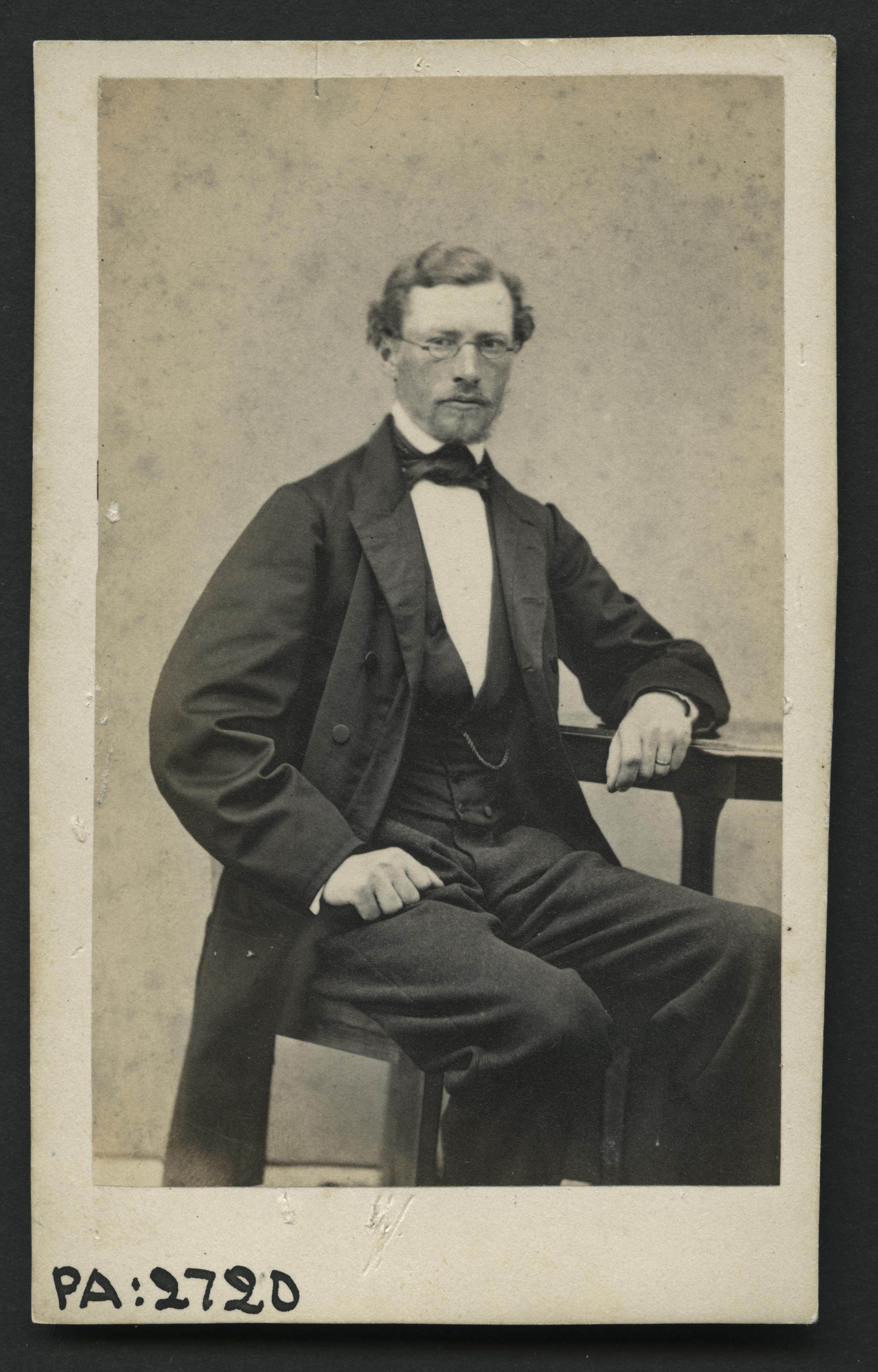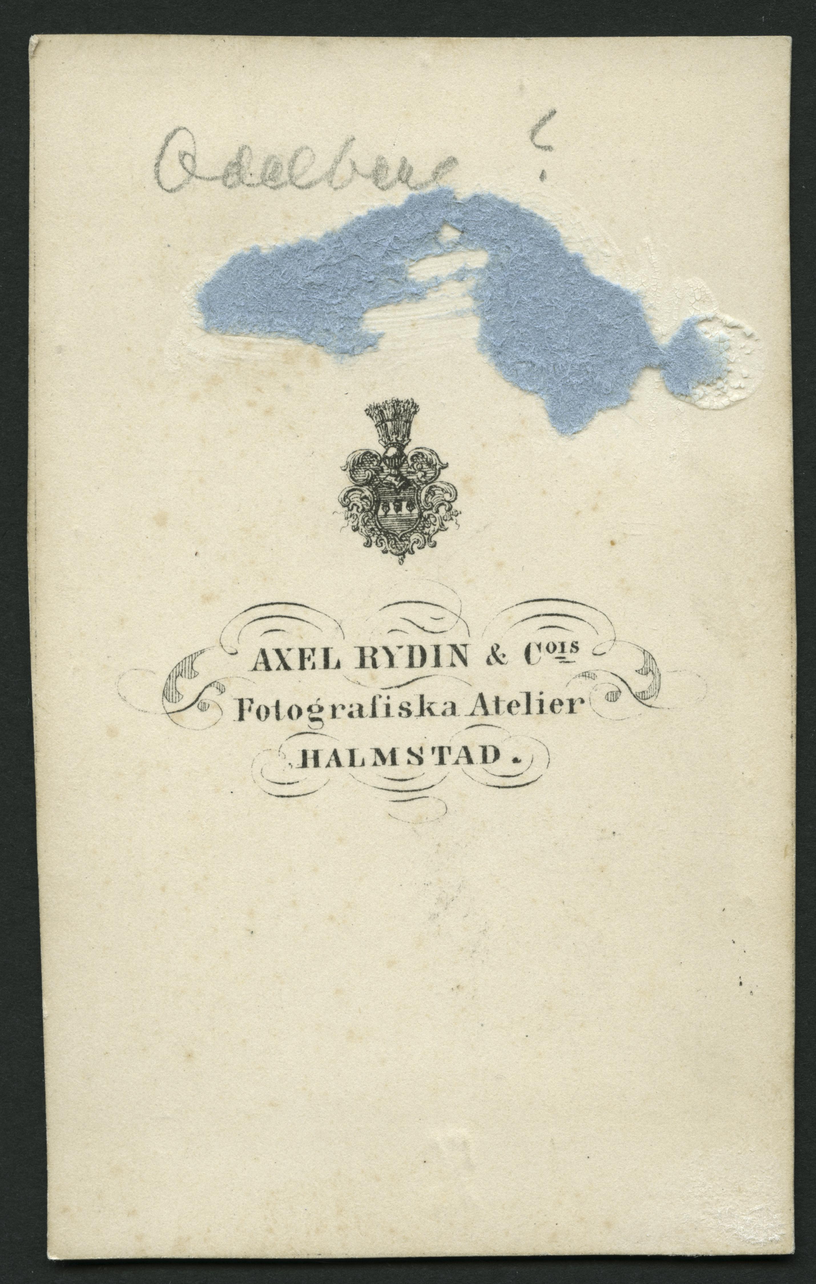 Visitkortsfotografi. Porträtt av okänd man, möjligen vid namn Odelberg enligt kortets baksida.