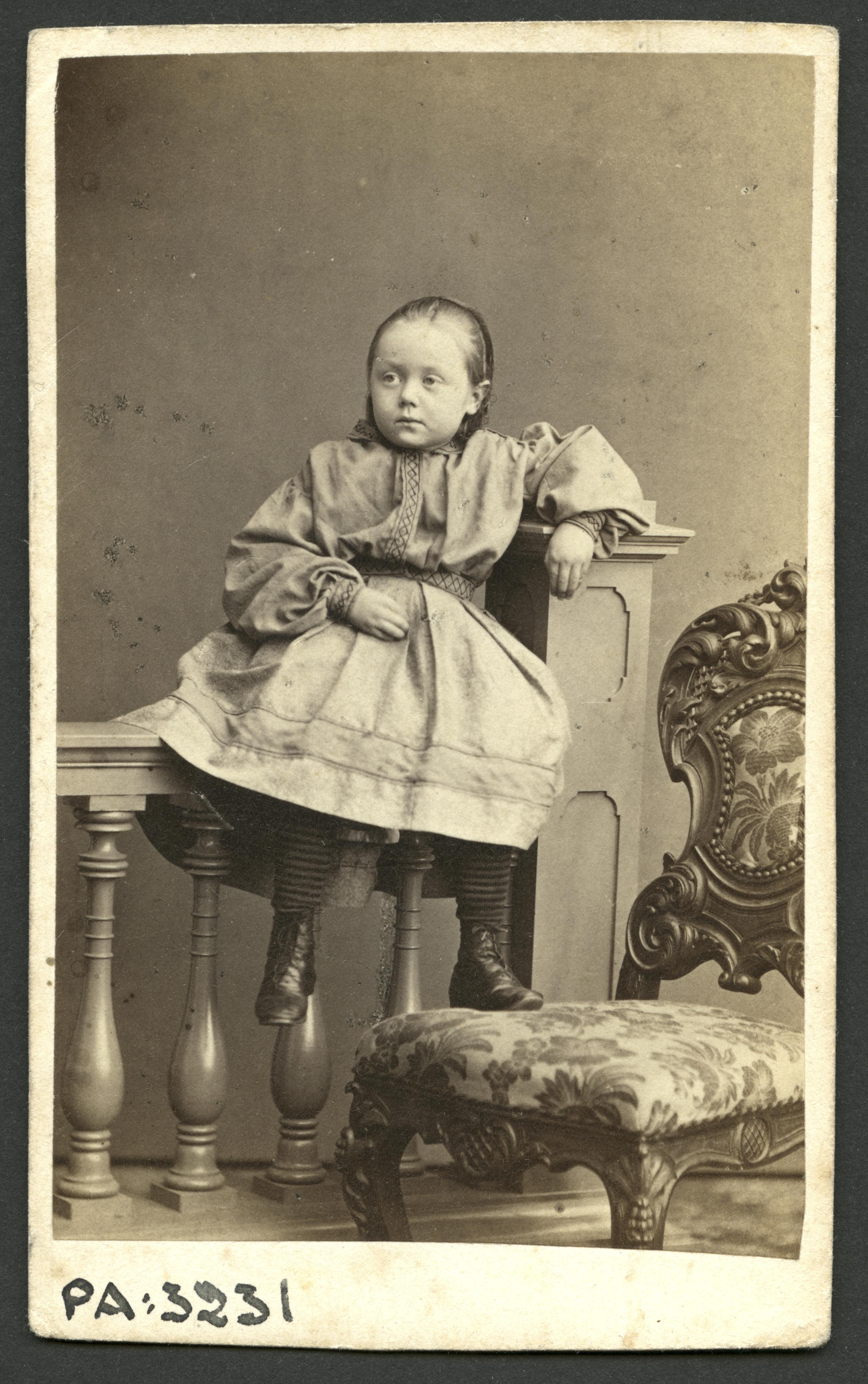 PA 003231 :: flicka, barn, klänning, stol, staket, balustrad