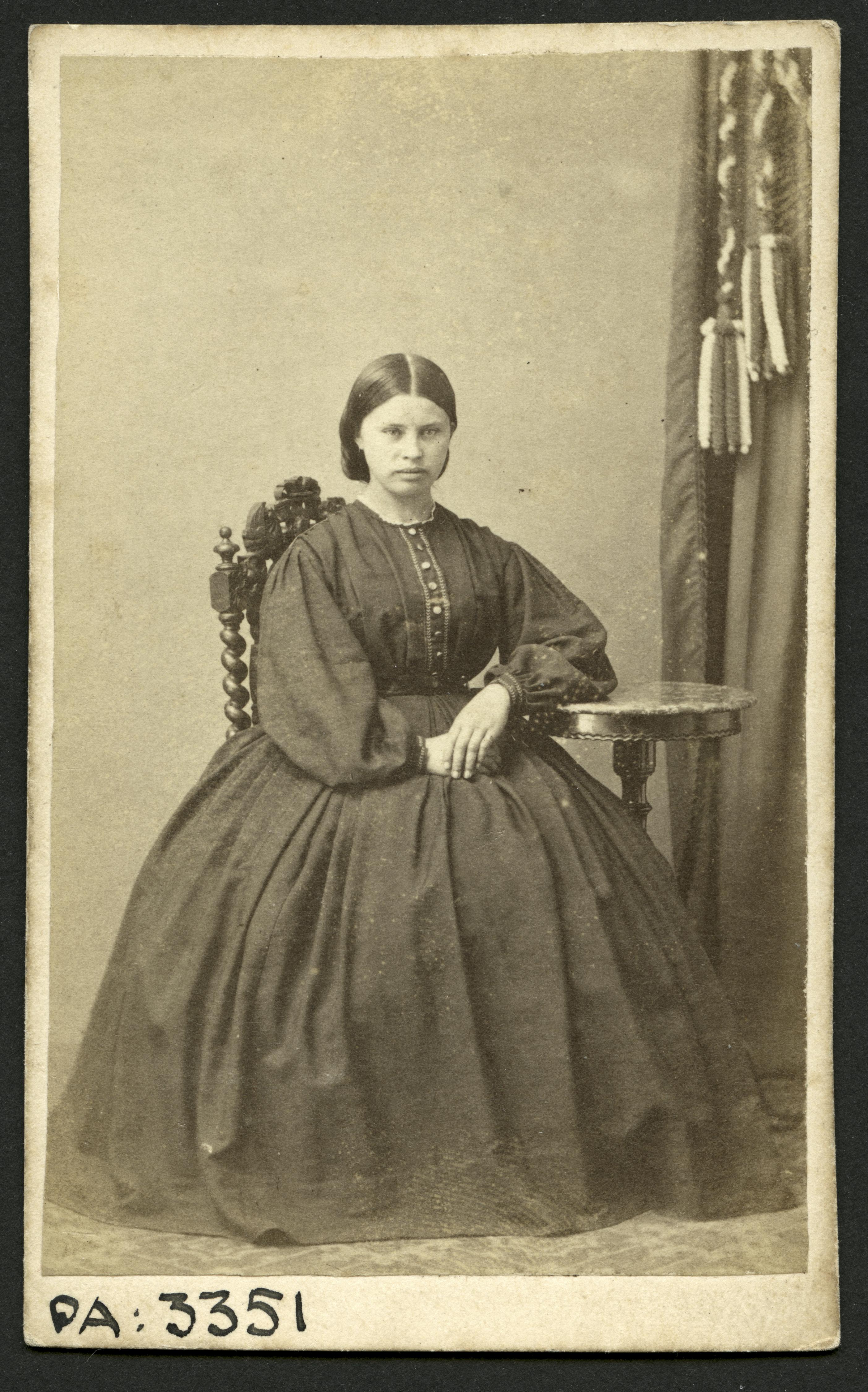 PA 003351 :: kvinna, stol, bord, draperi, tofs, klänning