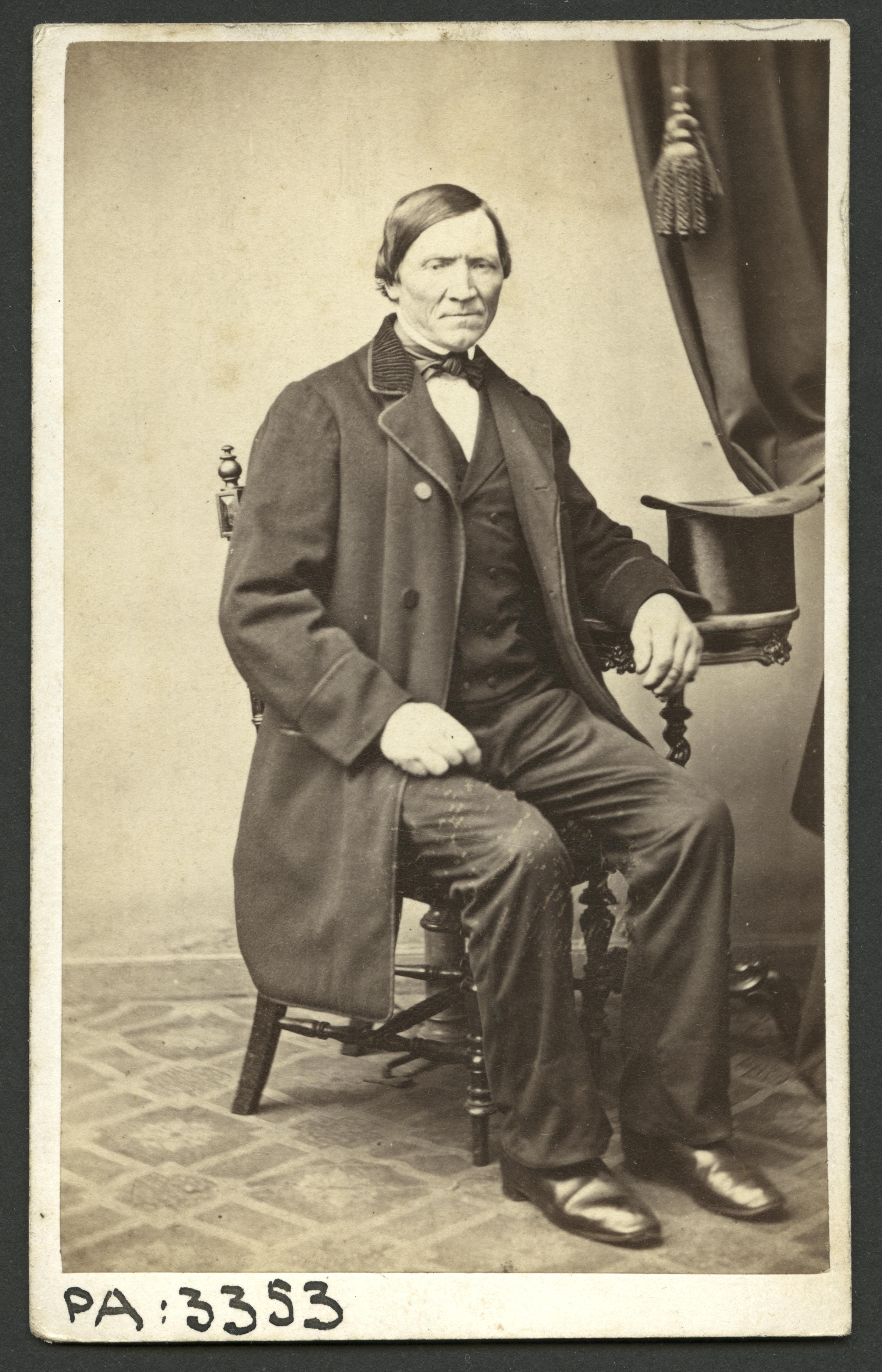 PA 003353 :: man, bord, herrhatt, hög hatt, stol, draperi, tofsar