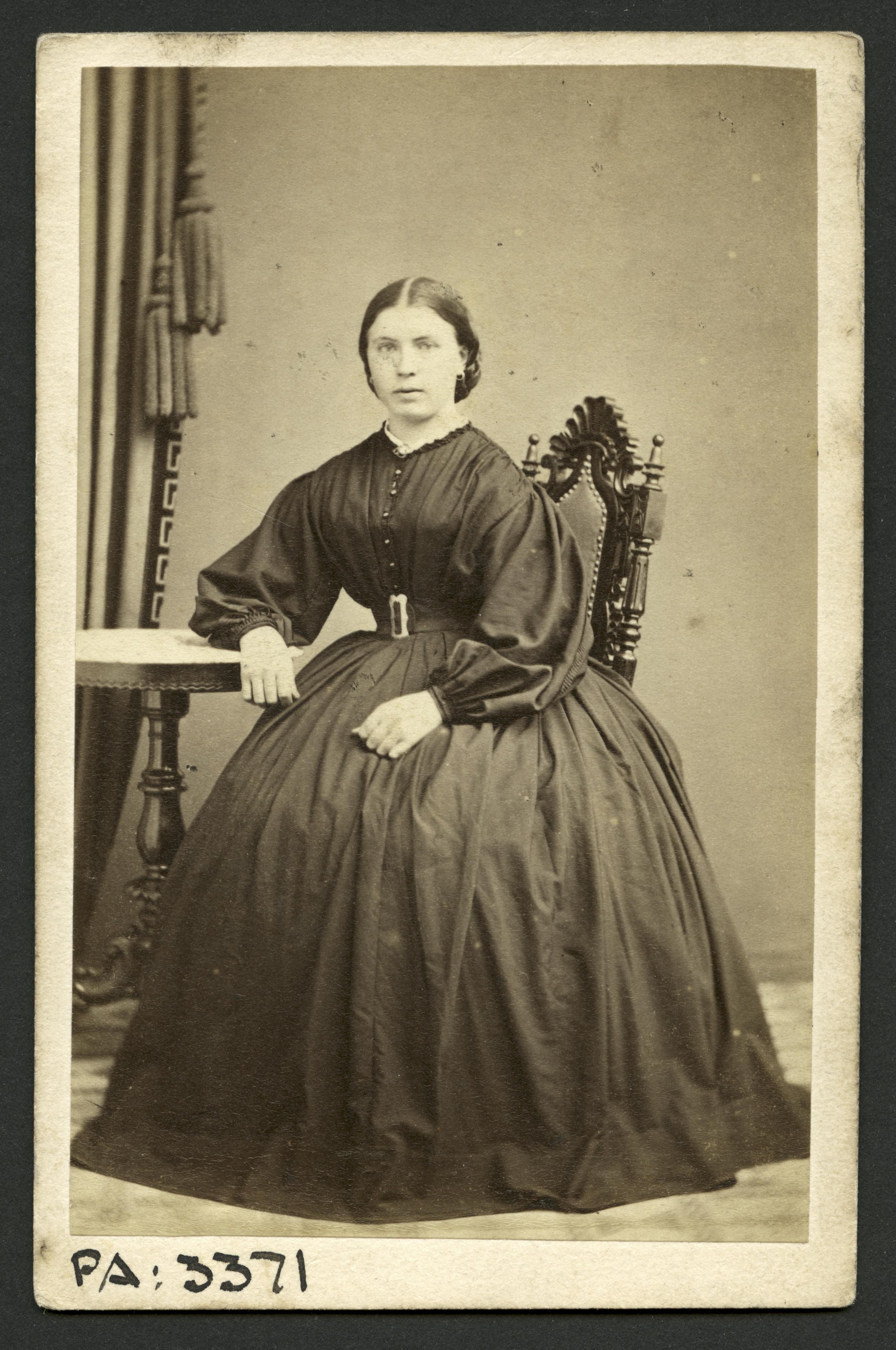 PA 003371 :: kvinna, bord, stol, draperi, tofsar, klänning