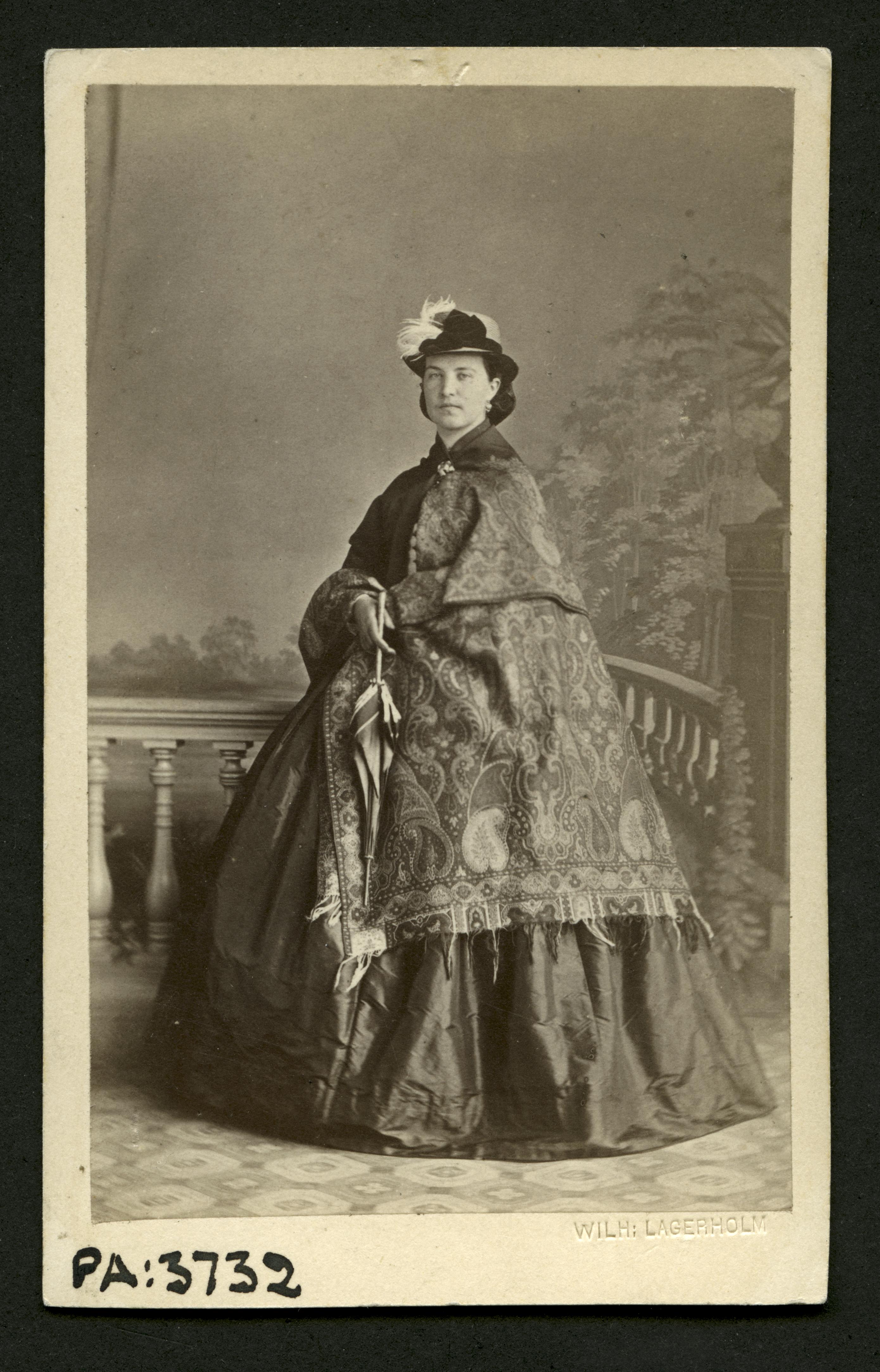 kvinna; damhatt; cape; parasoll; klänning; ateljéfond