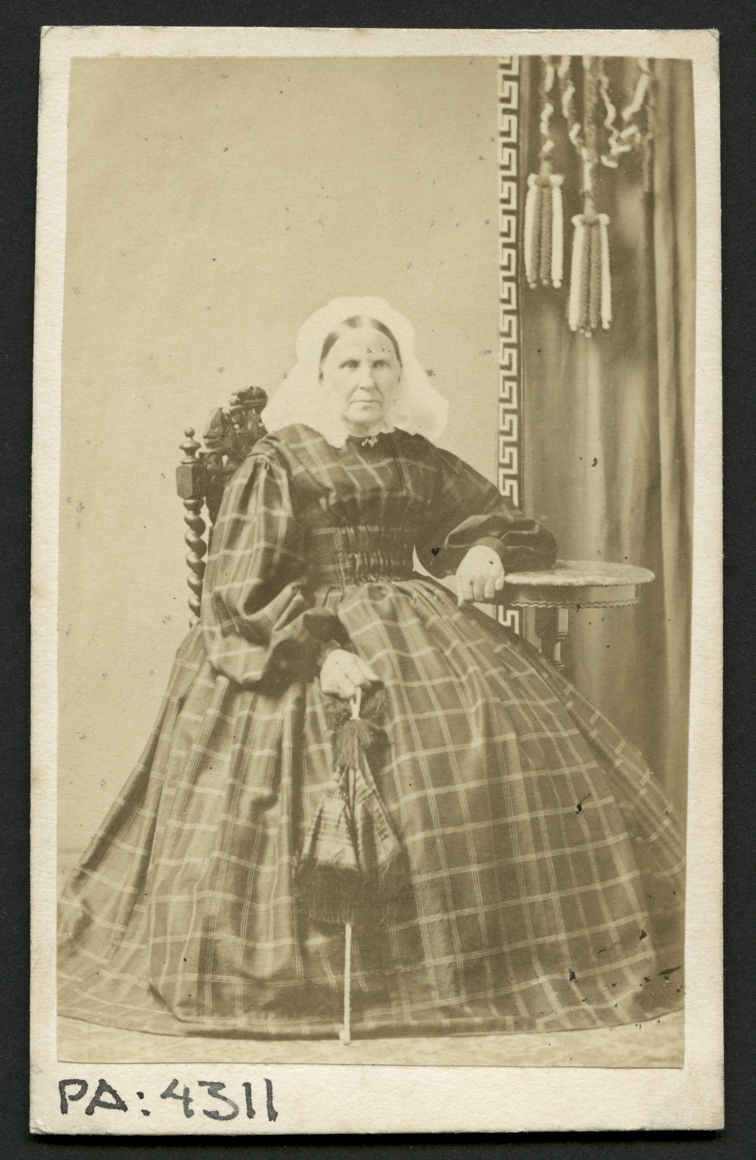 PA 004311 :: kvinna, bord, klänning, stol, draperi, huvudbonad, tofsar