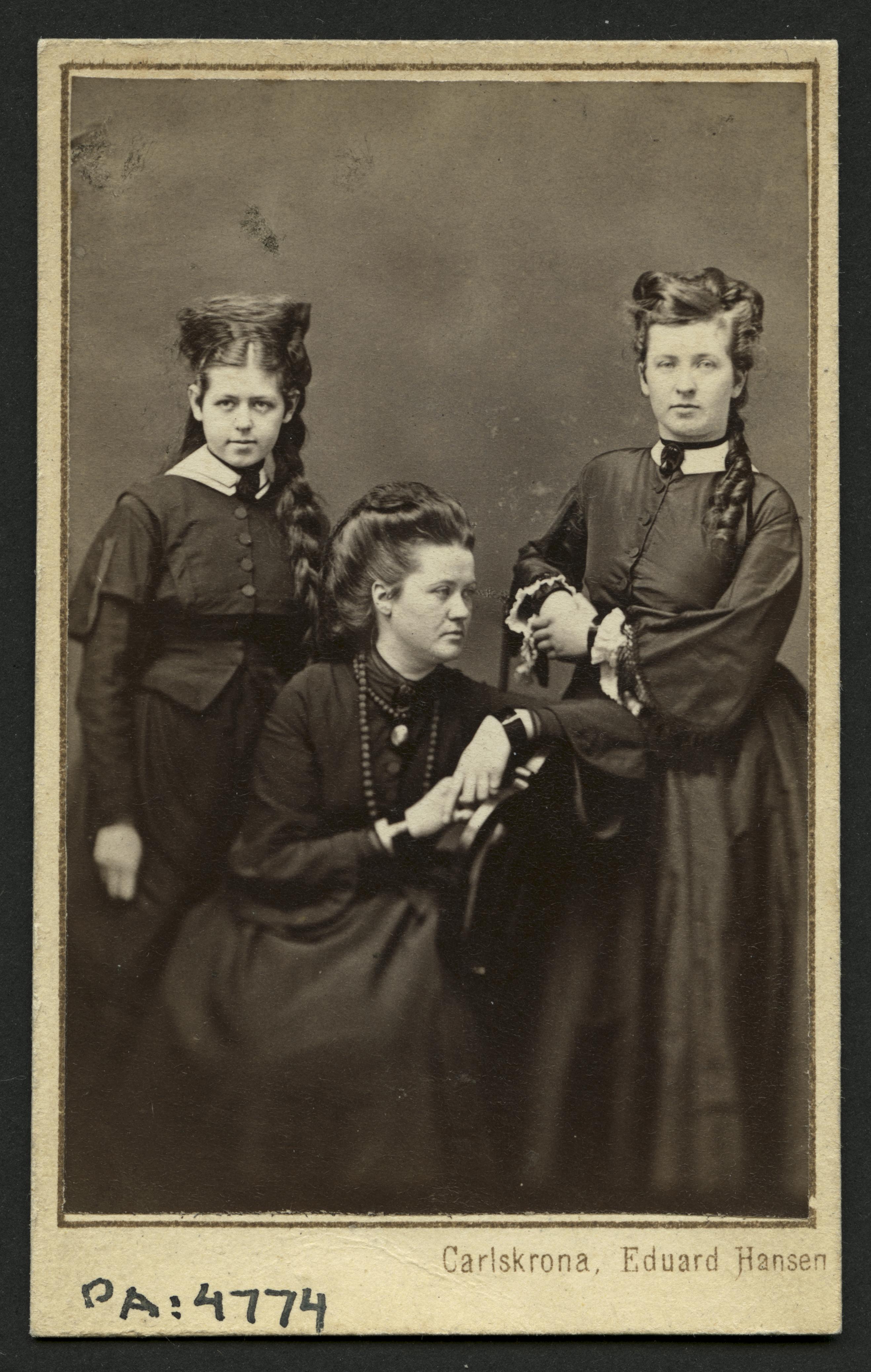 Visitkortsfotografi. Porträtt av tre okända kvinnliga konfirmander.
