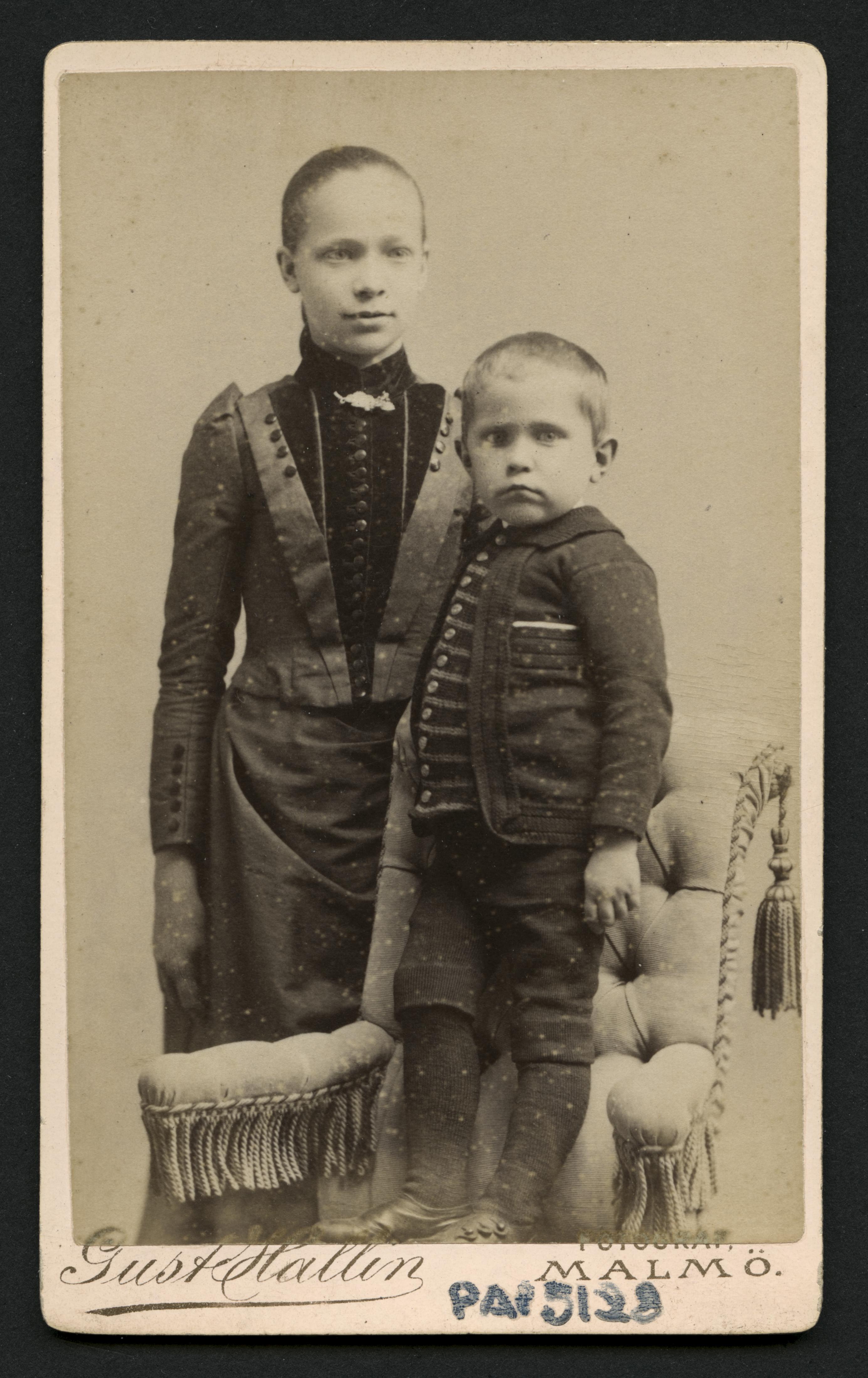 Visitkortsfotografi. Porträtt av okänd flicka och pojke.