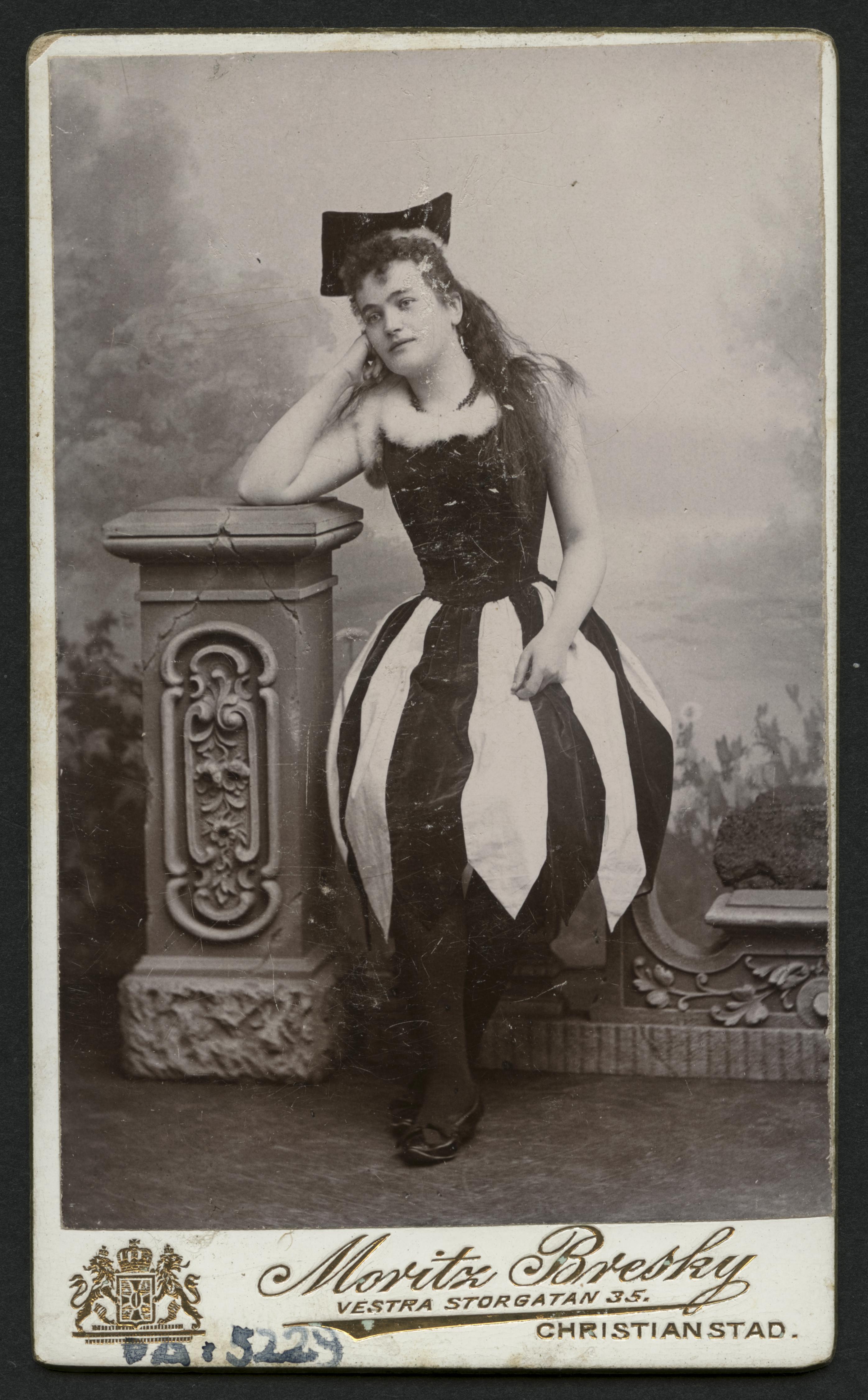 kvinna; huvudbonad; klänning; stenpelare; ateljéfond