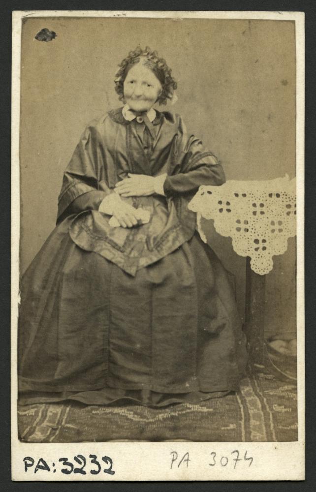 PA 003232 :: kvinna, huvudbonad, klänning, bord, duk
