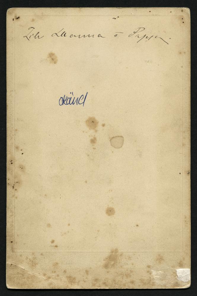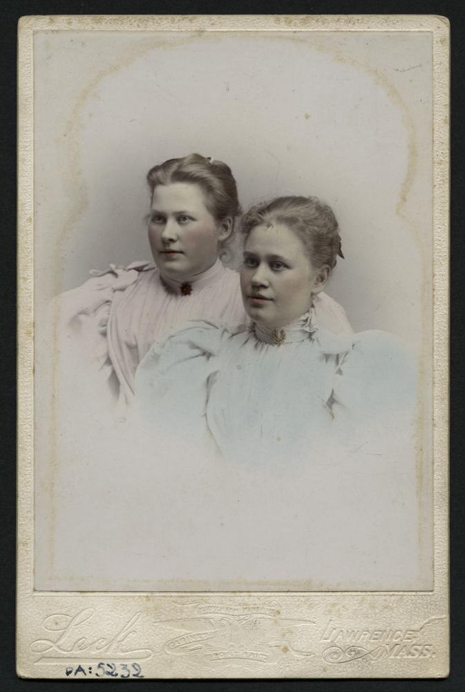 Visitkortsfotografi. Porträtt av två okända kvinnor. Skrivet på kortets baksida: "Till Mamma o Pappa".