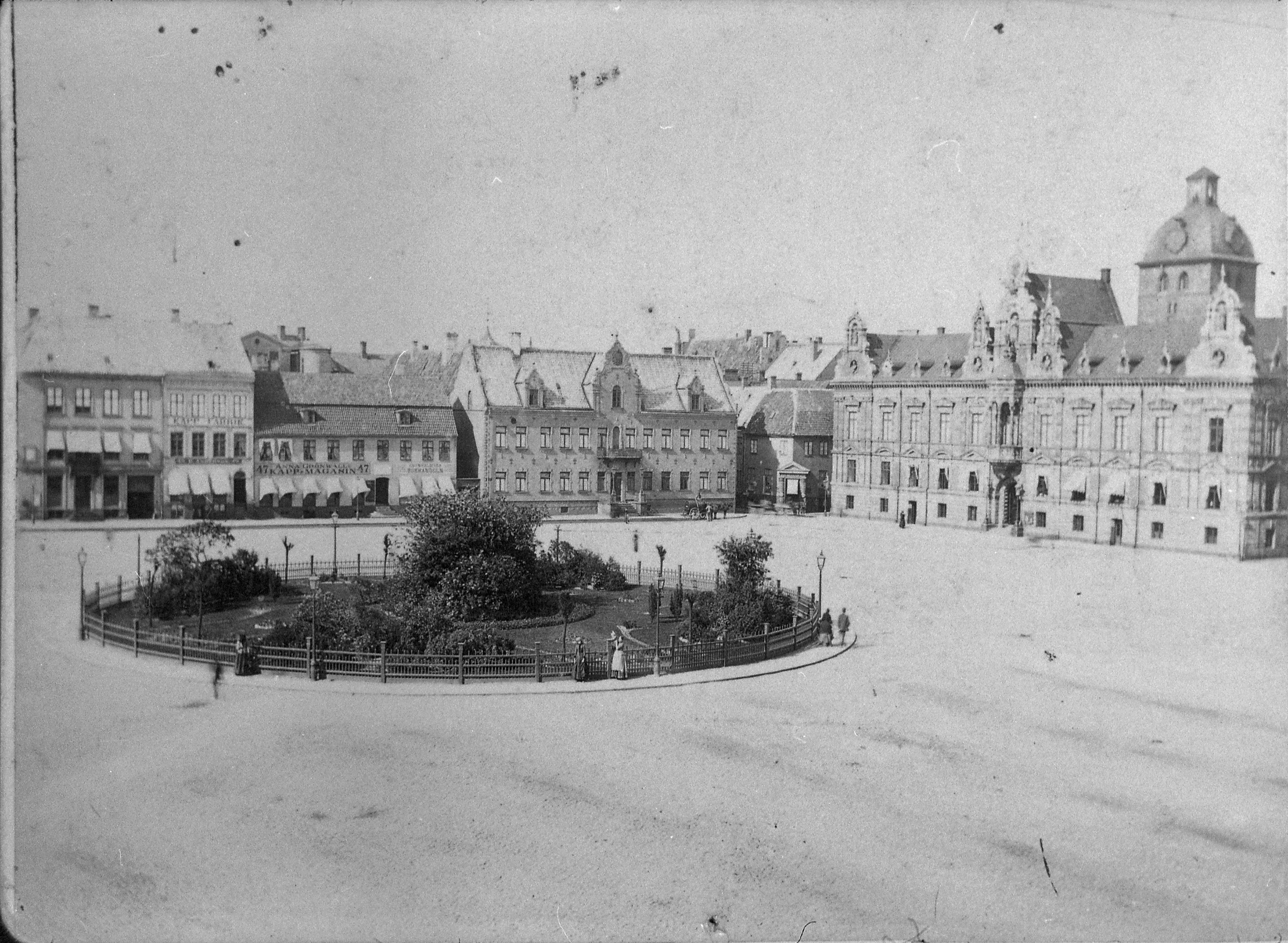 Efter mer studier så bör nu bestämt flyttas fotots tillkomst senast juli 1887. Detta av den anledningen att i maj 1887 påbörjades skennerläggningen av Malmös första hästspårväg vid Mälarbron/nya Tullhuset. På fotot skall denna spårväg bland annat passera östra sidan vid Rådhuset och den norra för att vidare gå ut genom Frans Suellgatan ut mot Norra Vallgatan och möta Mälarbron. Spåren skulle sedan gå genom Södergatan-GAT:s östra och västra sidor-Södra Förstadsgatan-Södervärn. Fotot här har inga påbörjade spår. Hästspårvägen invigdes den 28 augusti 1887. Så Anna Grönvalls Kapp-Magasin har startat tidigare på året utan att för den skull egentligen ha behövt annonsera då folk i staden redan kände till firman rätt så bra. Så ovanstående foto har tagits innan arbetena för att lägga ner spår i gatan har påbörjats. Kan ju haft en historisk aspekt för historiskt bevarande av fotografen hur platsen var innan spårvägen kom på plats. Nu kunde ju inte torghandeln bedrivas framför Rådhuset i heller och fick flyttas till torgets västra och södra sidor.Atatlas2024-06-23 15:17