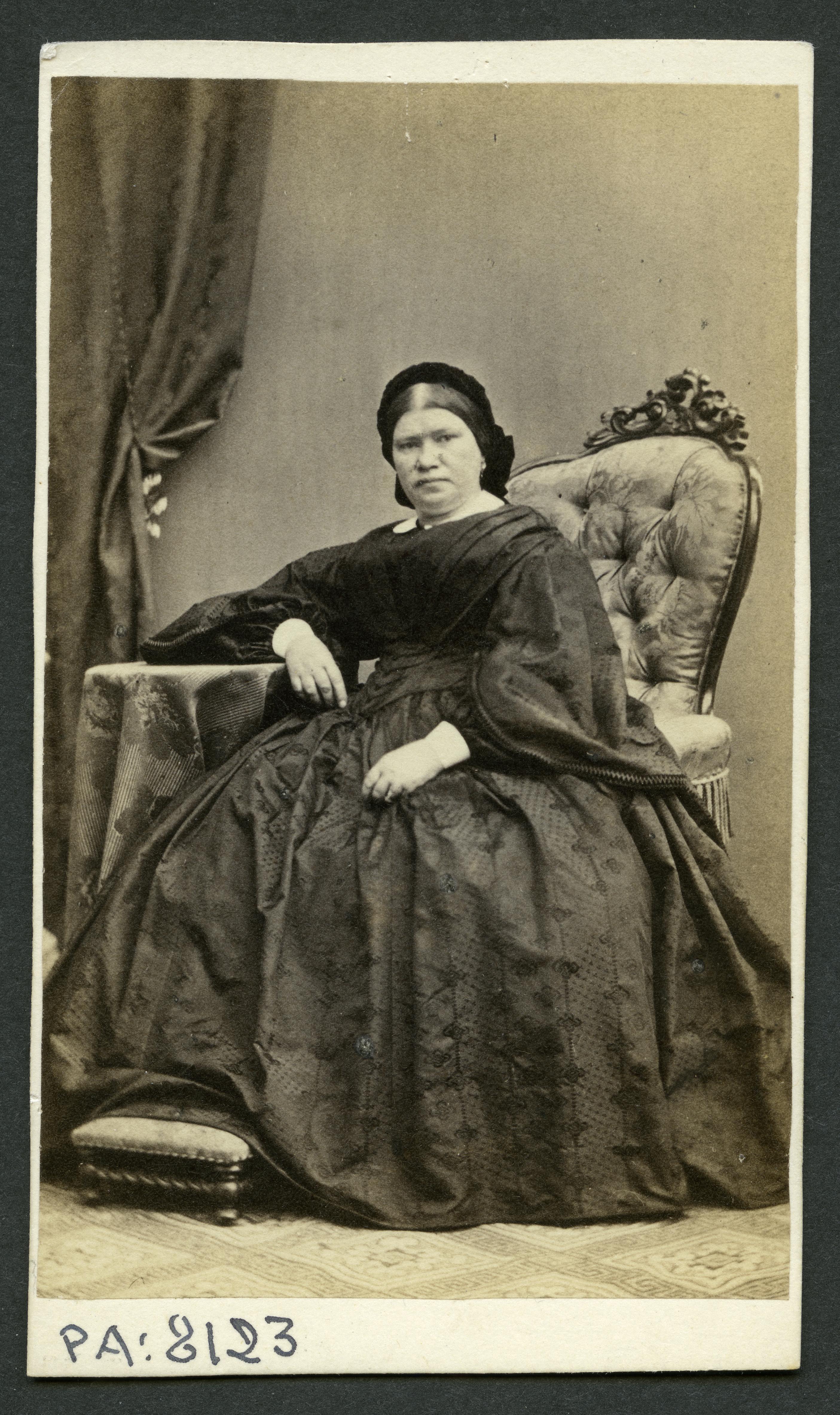 PA 008123:002 :: kvinna, hätta, klänning, fåtölj, bord, bordsduk, fotpall, draperi