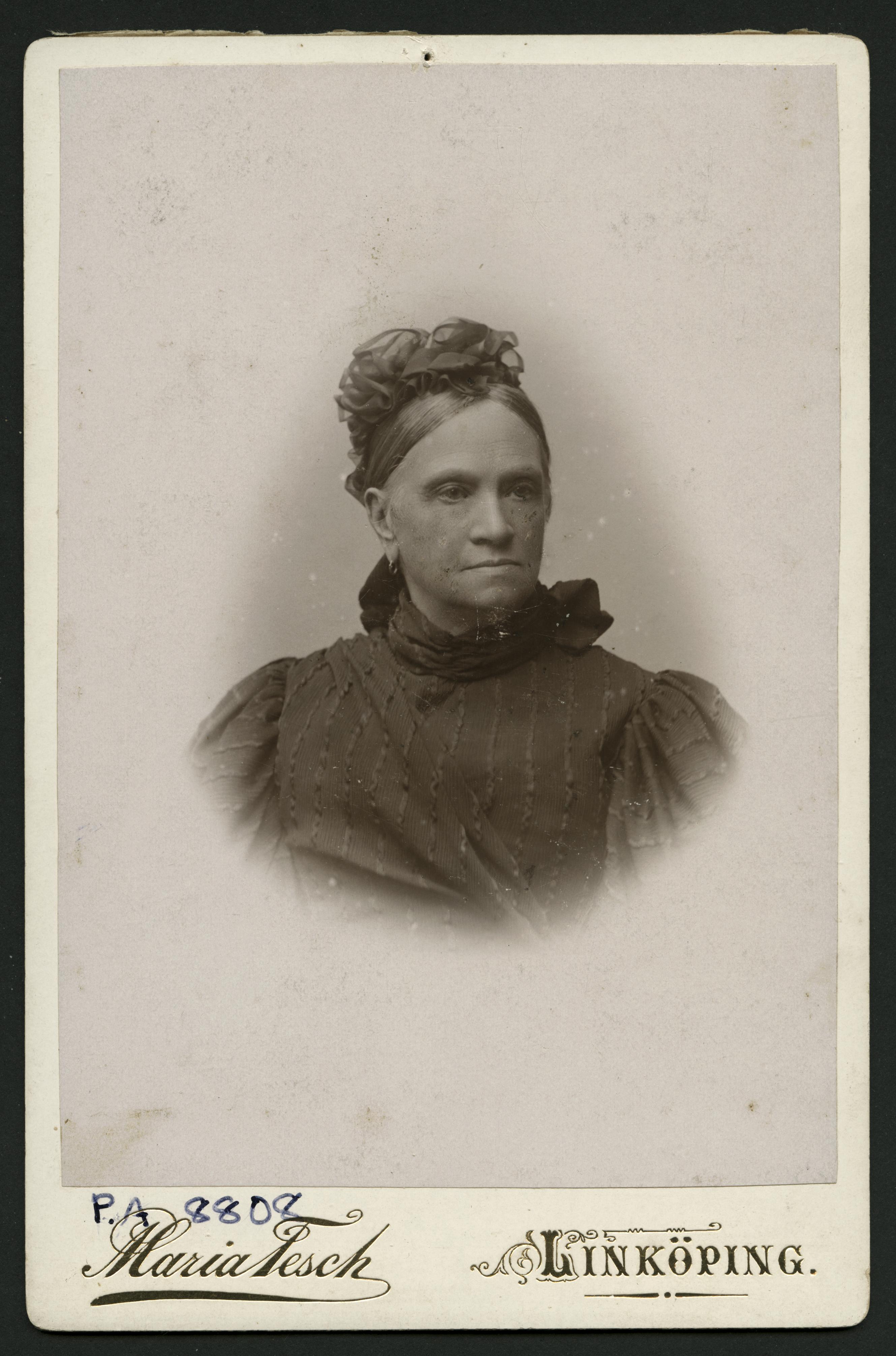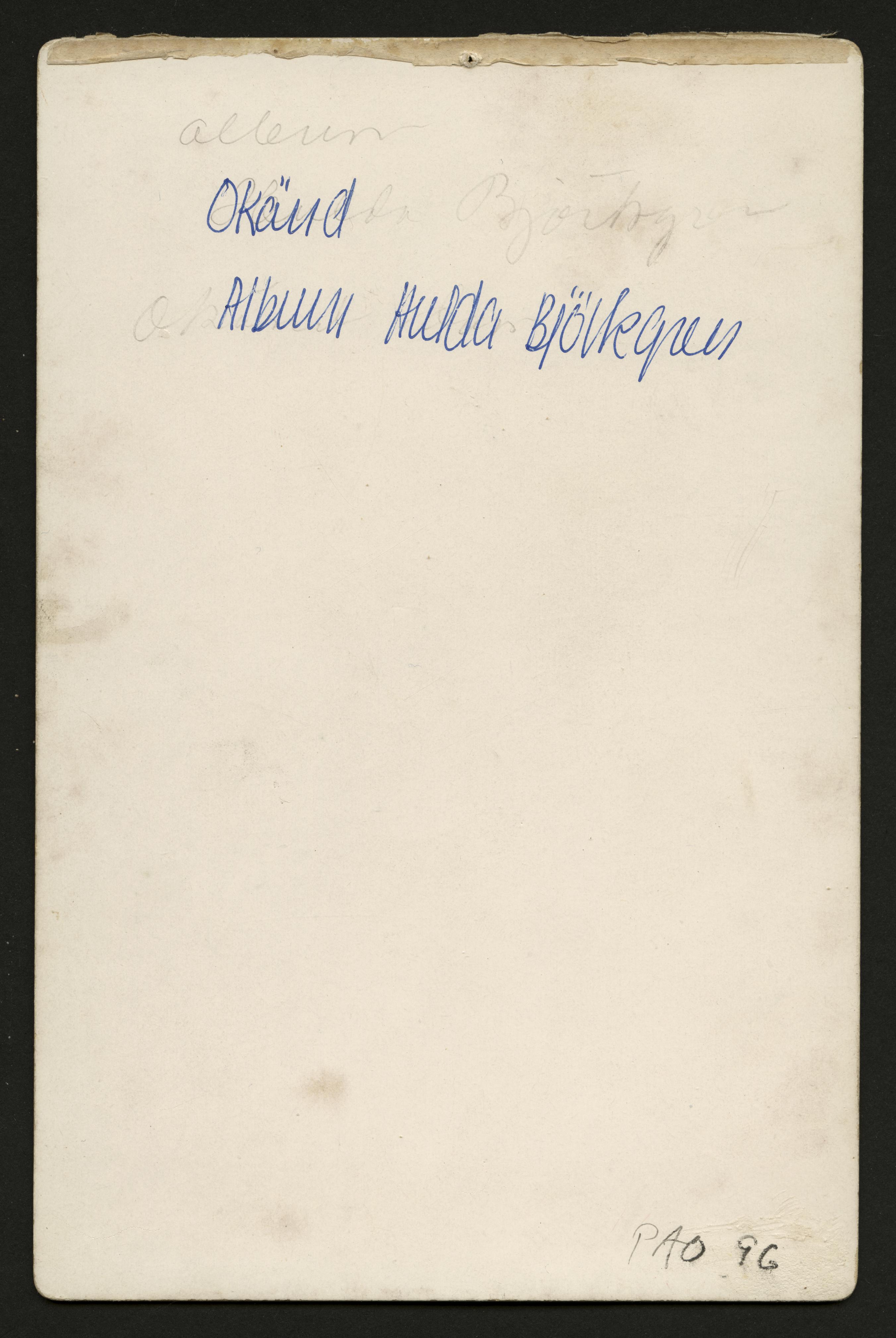 Visitkortsfotografi. Porträtt av okänd kvinna. Från Hulda Björkgrens privata album. Skrivet på kortets baksida: "Album /Hulda Björkgren".