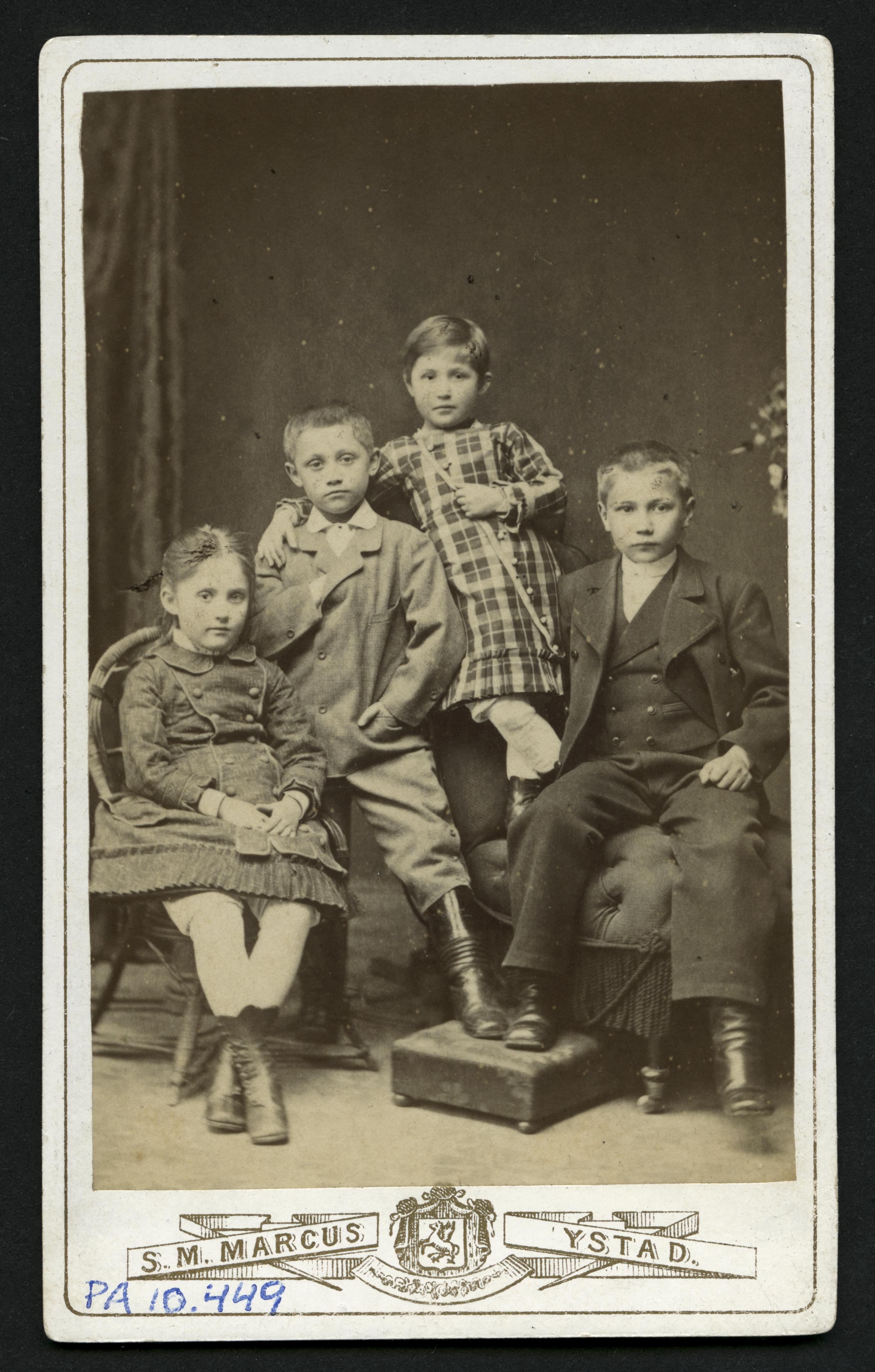 Visitkortsfotografi. Porträtt av fyra okända barn, två flickor och två pojkar.