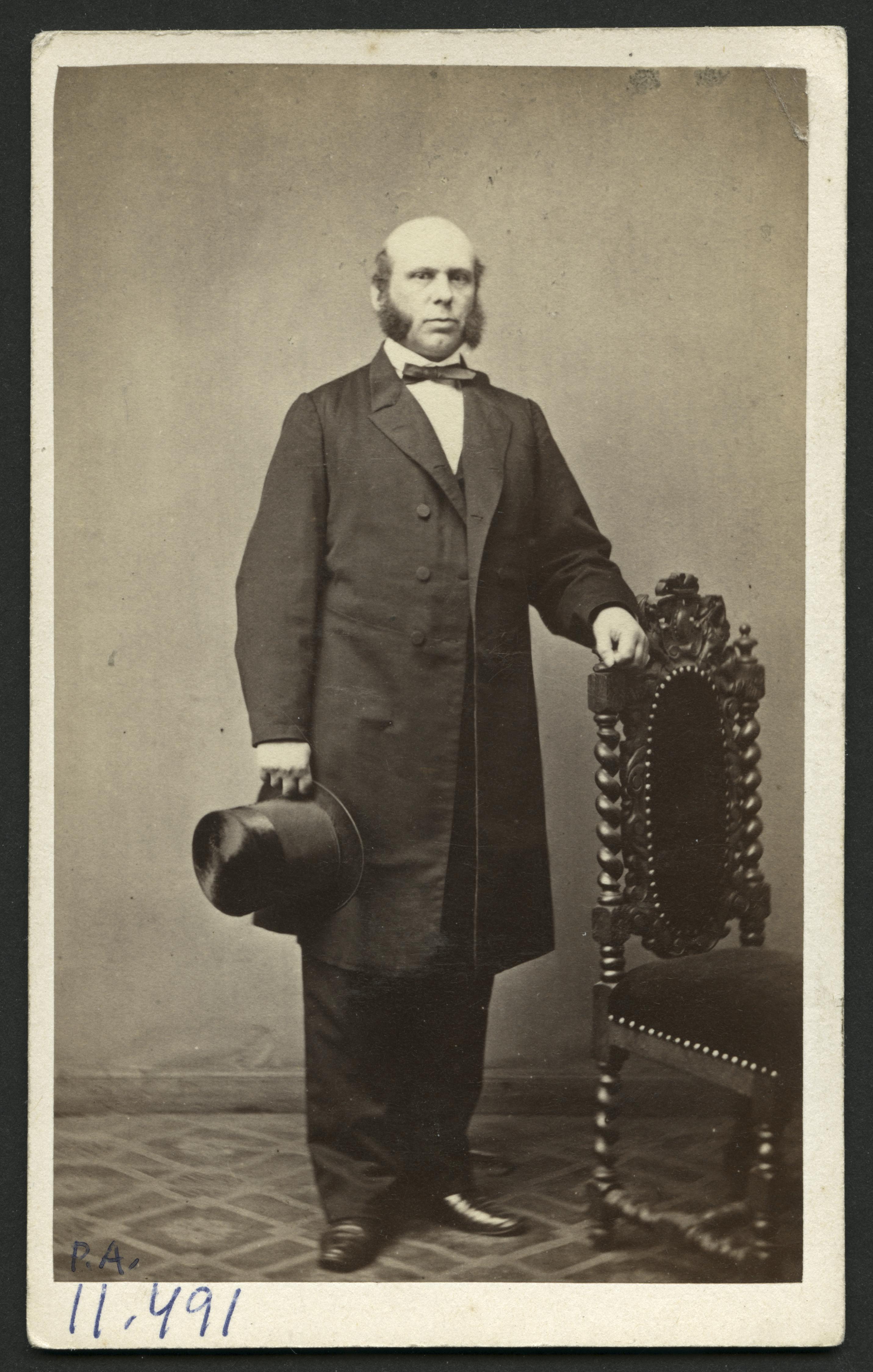 PA 011491 :: man, herrhatt, herrock, hög hatt, stol