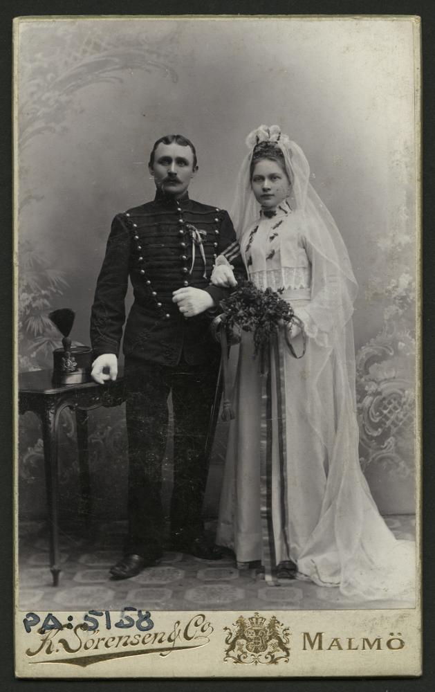 kvinna; man; brudklänning; slöja; bord; militäruniform [?]