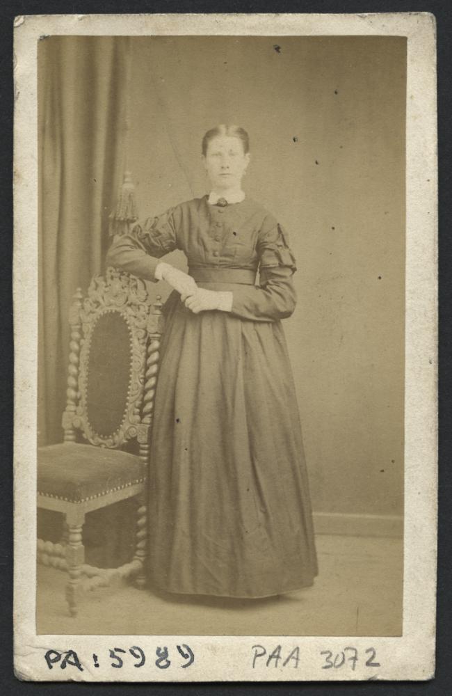 PA 005989 :: kvinna, klänning, stol, draperi, tofs