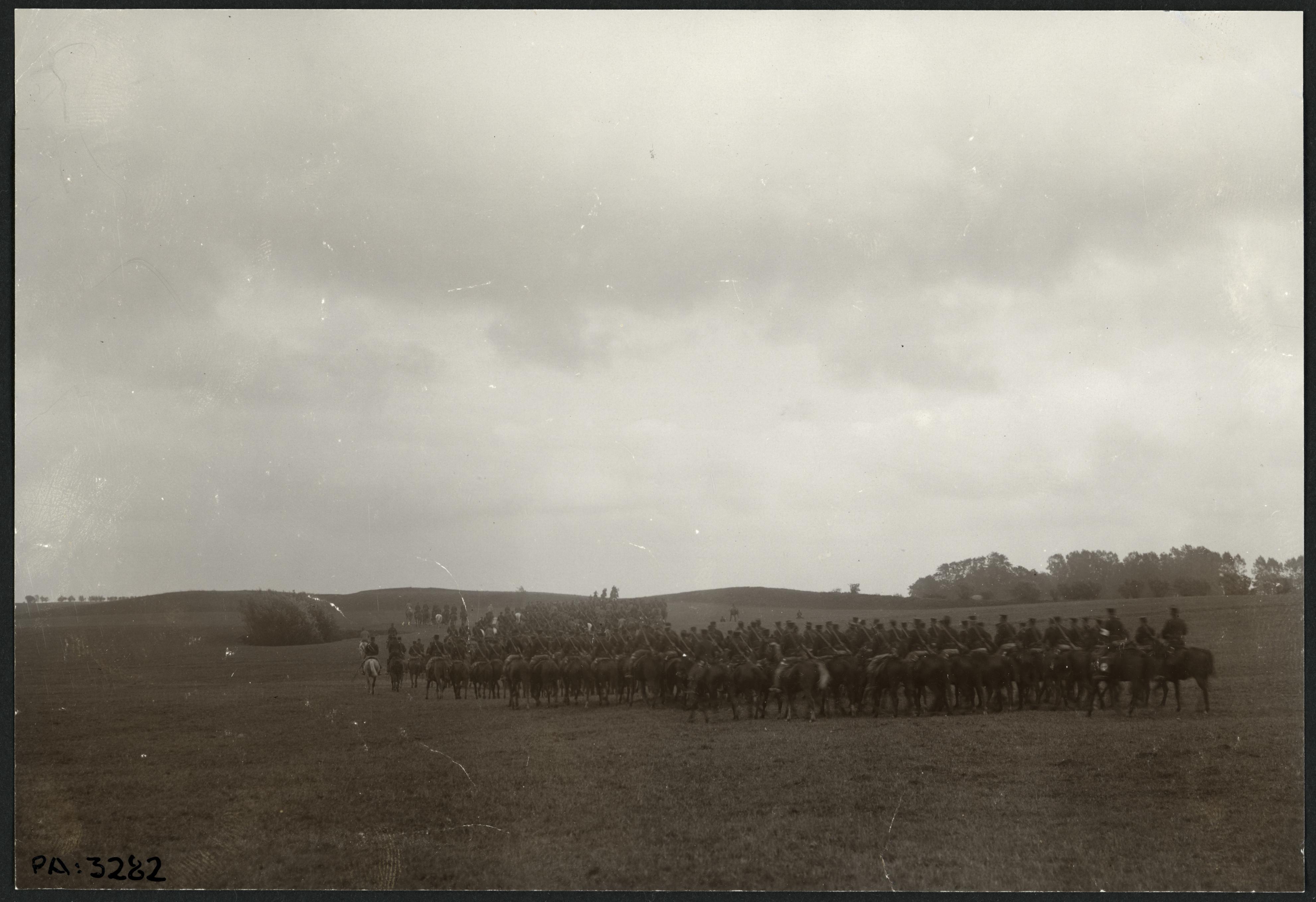 Fotografi på Kronprinsens Husarregementes övning på Bulltofta 1915.