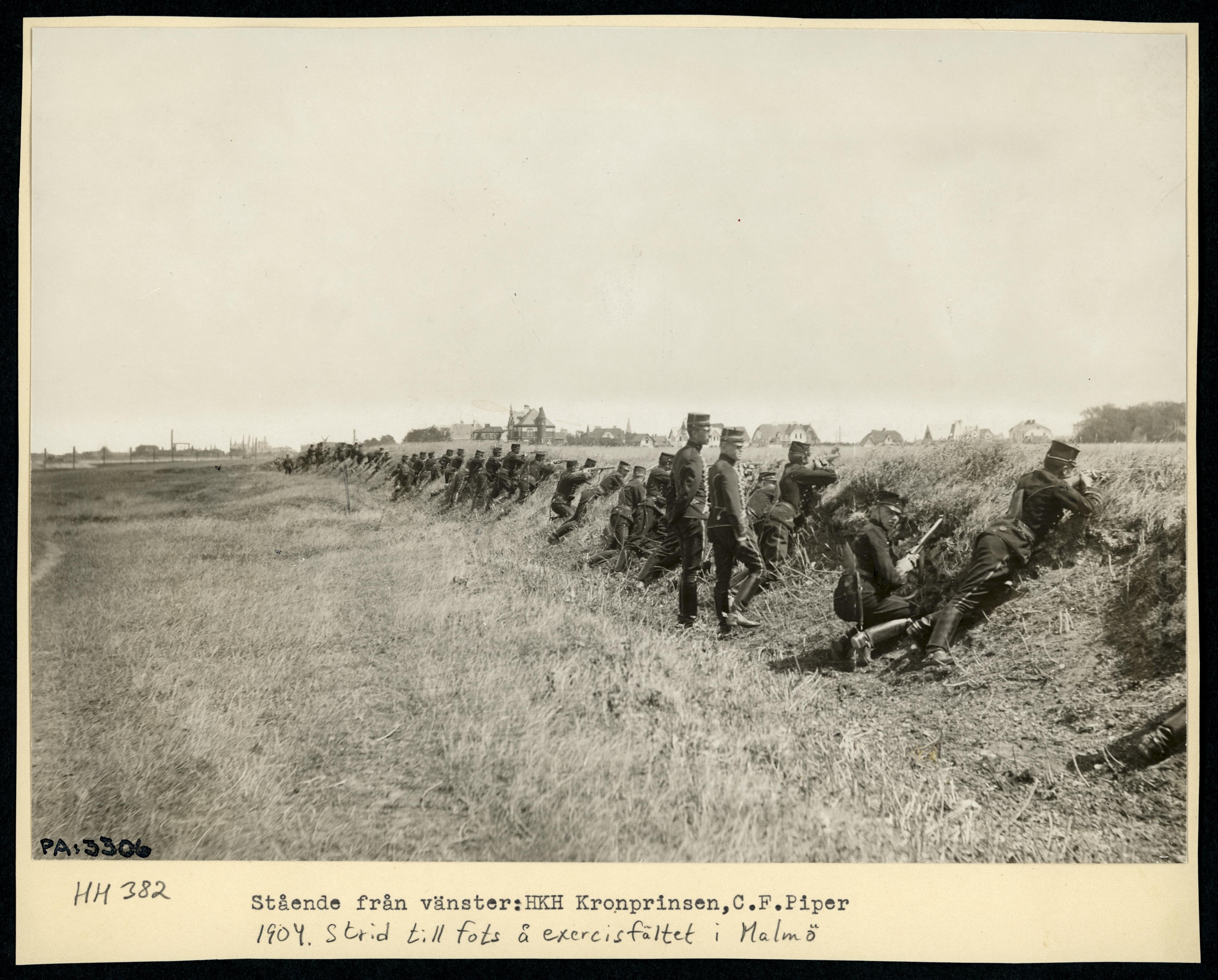 Porträtt av militärer i fält från Kronprinsens Husarregemente. Namngivna: prins Carl och C. F. Piper.
