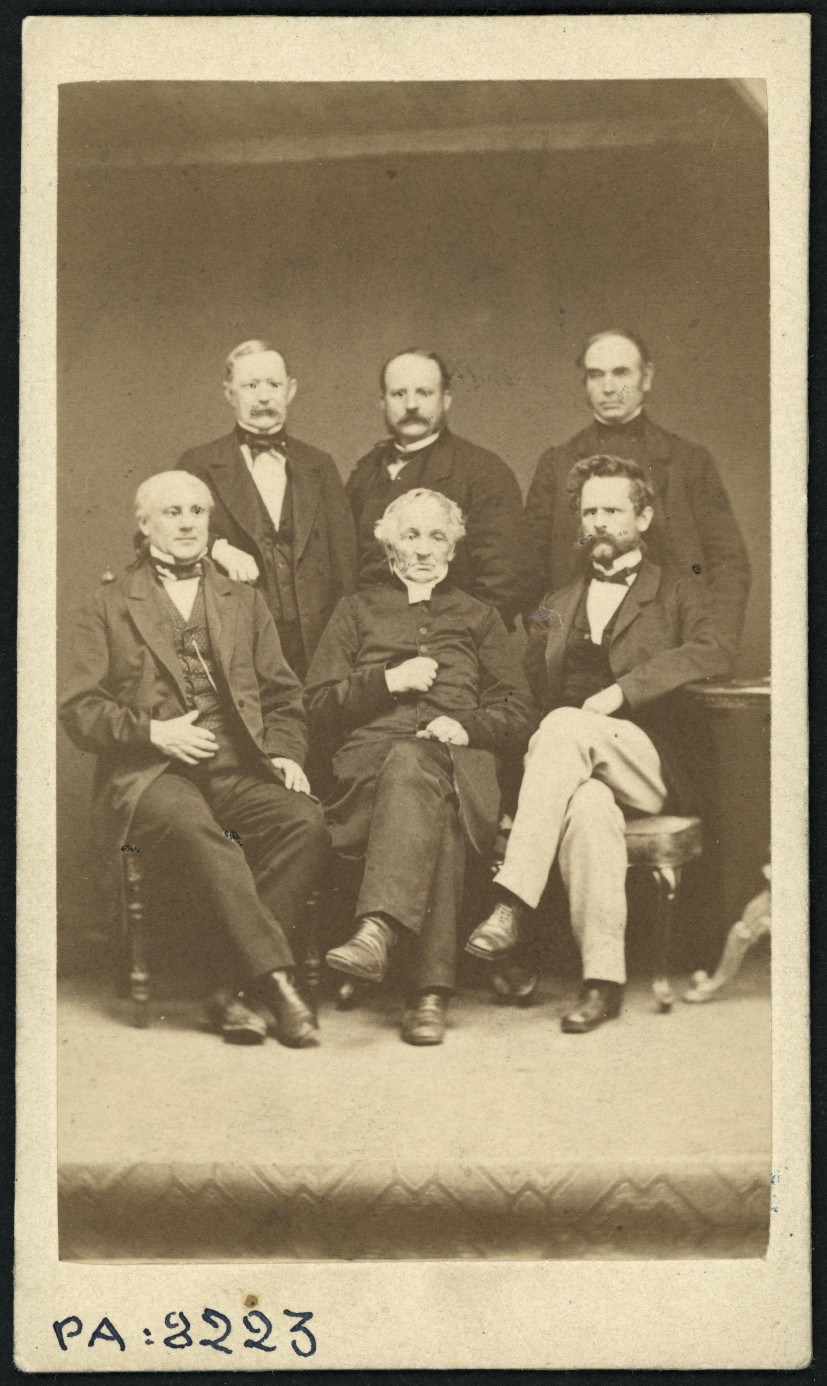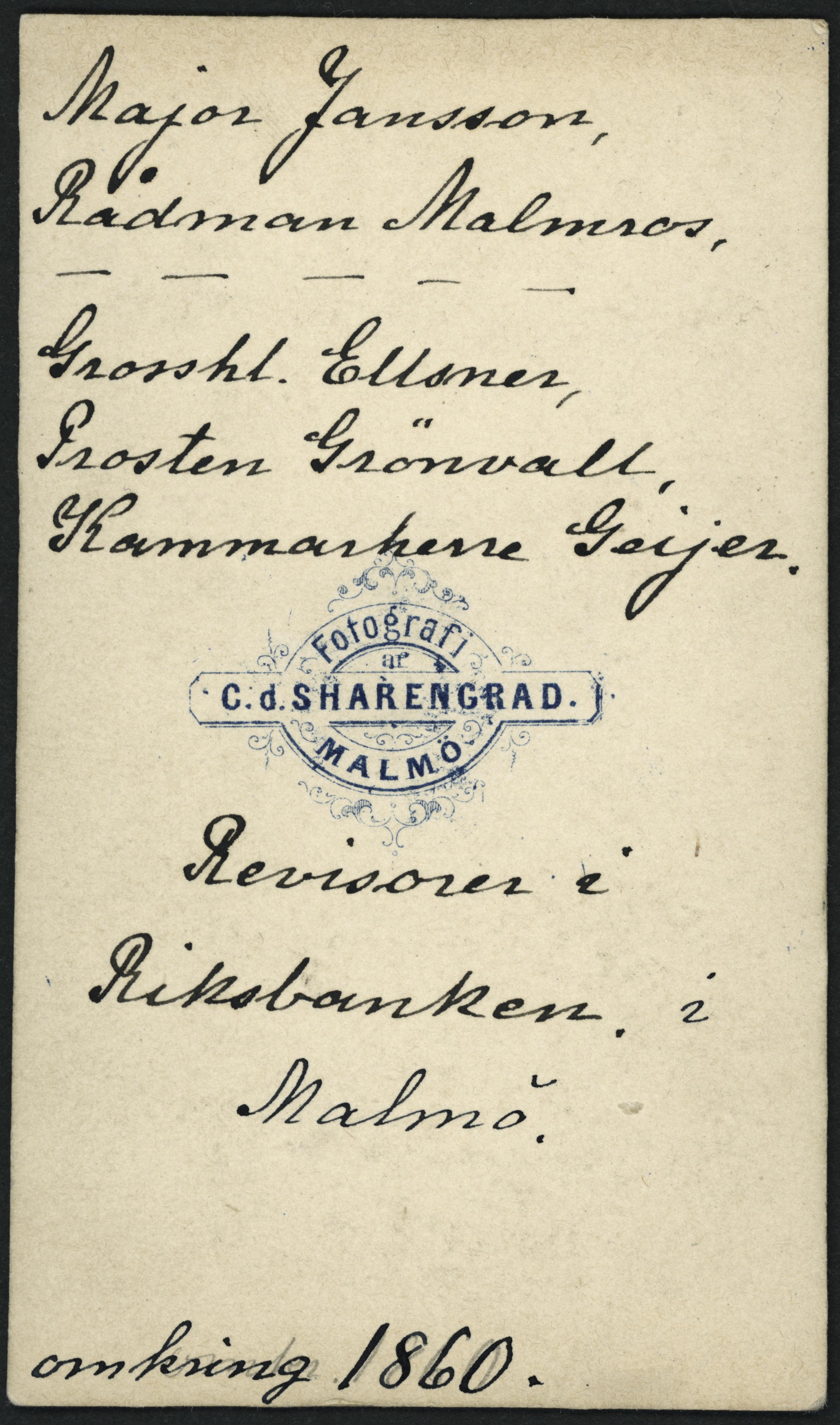 Visitkortsfotografi. Porträtt av revisorerna i Malmö Riksbank: major Jansson, rådman Malmros, grosshandlare P. M. Elsner, kyrkoherde Henrik Grönvall, kammarherre Gottsshalk von Geijer samt okänd man.