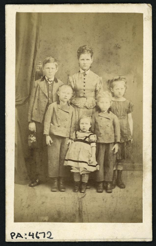 Visitkortsfotografi. Porträtt av okänd kvinna och barn, möjligen moder med söner och döttrar.