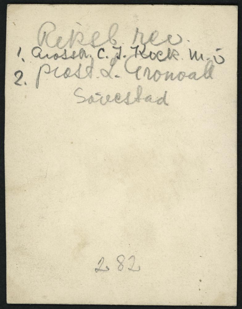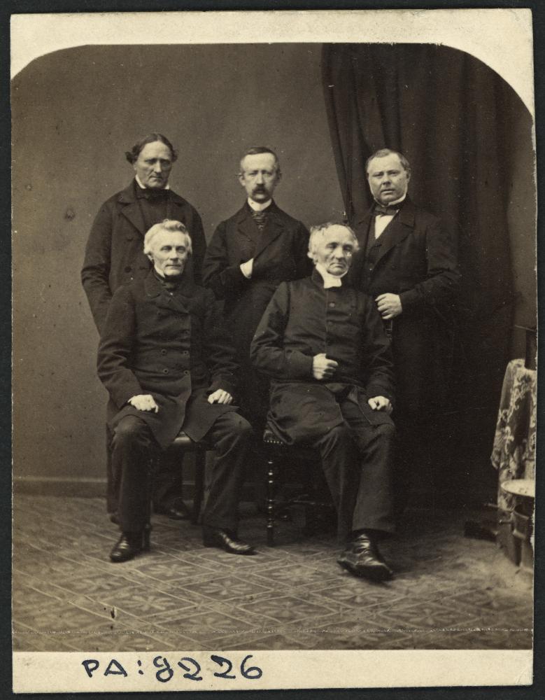 Visitkortsfotografi. Porträtt av revisorerna i Malmö Riksbank: kyrkoherde Henrik Grönvall och grosshandlare Carl Jöran Kock samt fyra okända män.