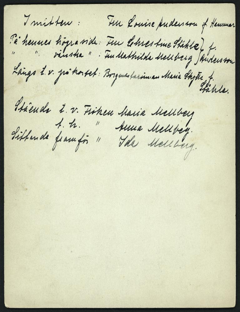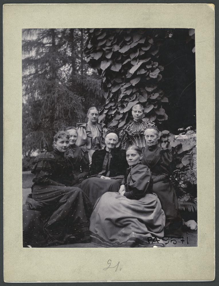 - Grupporträtt i trädgårdsmiljö av tre generationer kvinnor av de ingifta familjerna Andersson, Hammar, Mellberg, Ståhle och Skytte: Louise Hammar, Christina Ståhle, Anna Mathilda Mellberg, Maria Skytte, samt Maria, Anna och Ida Mellberg.