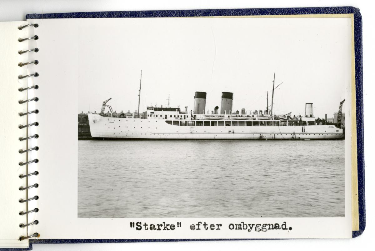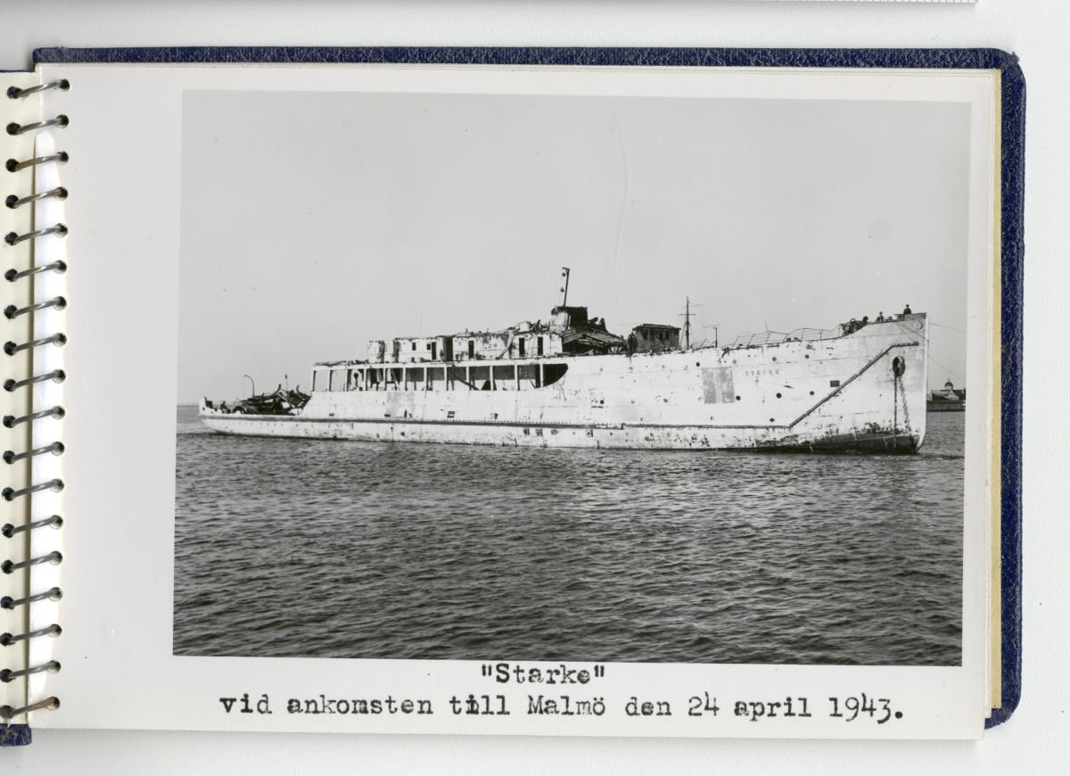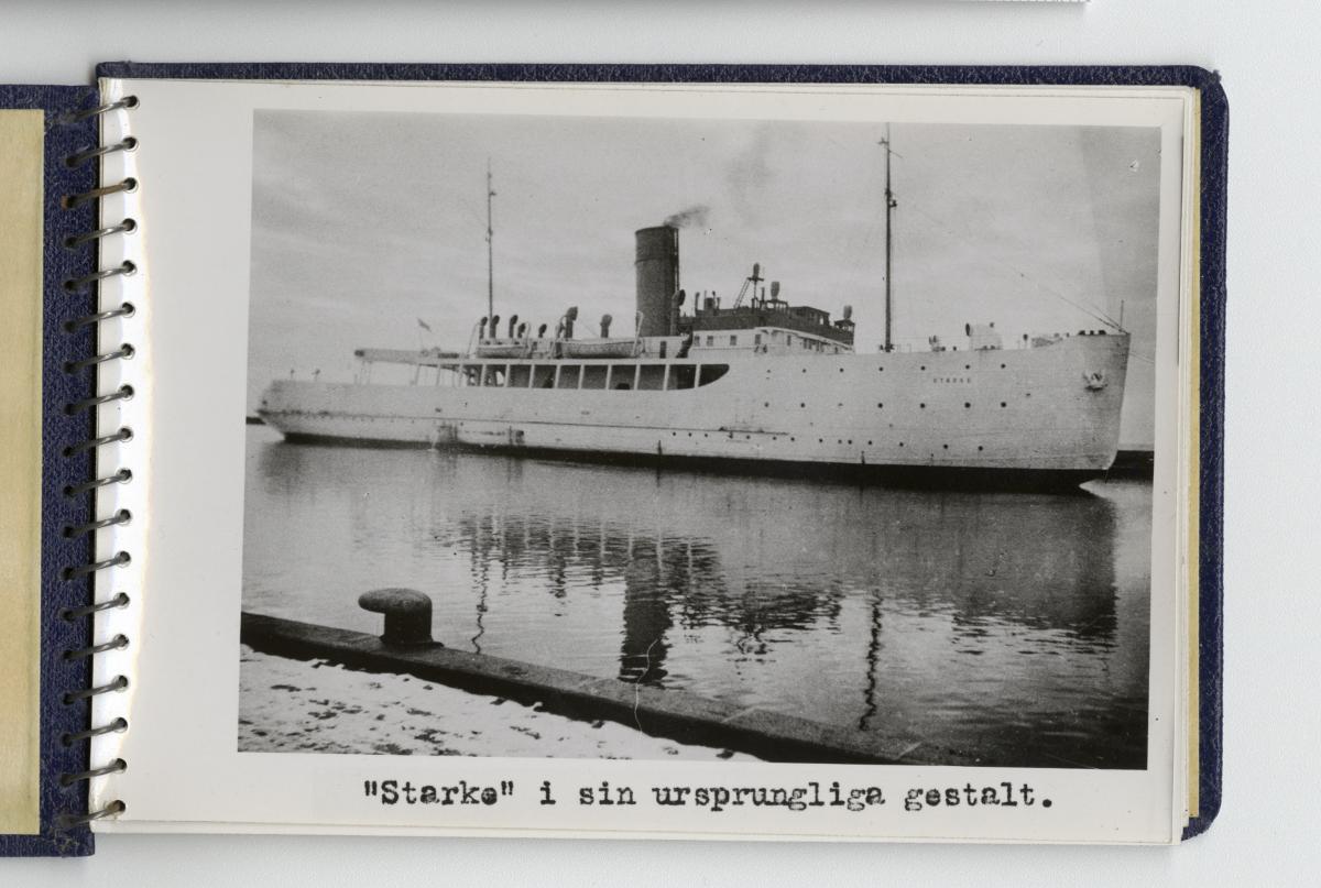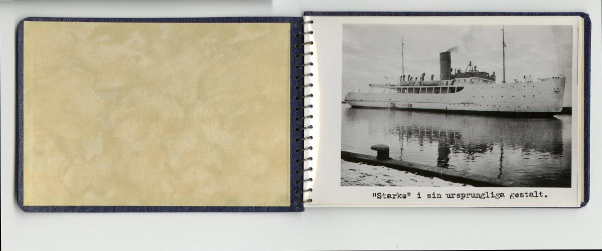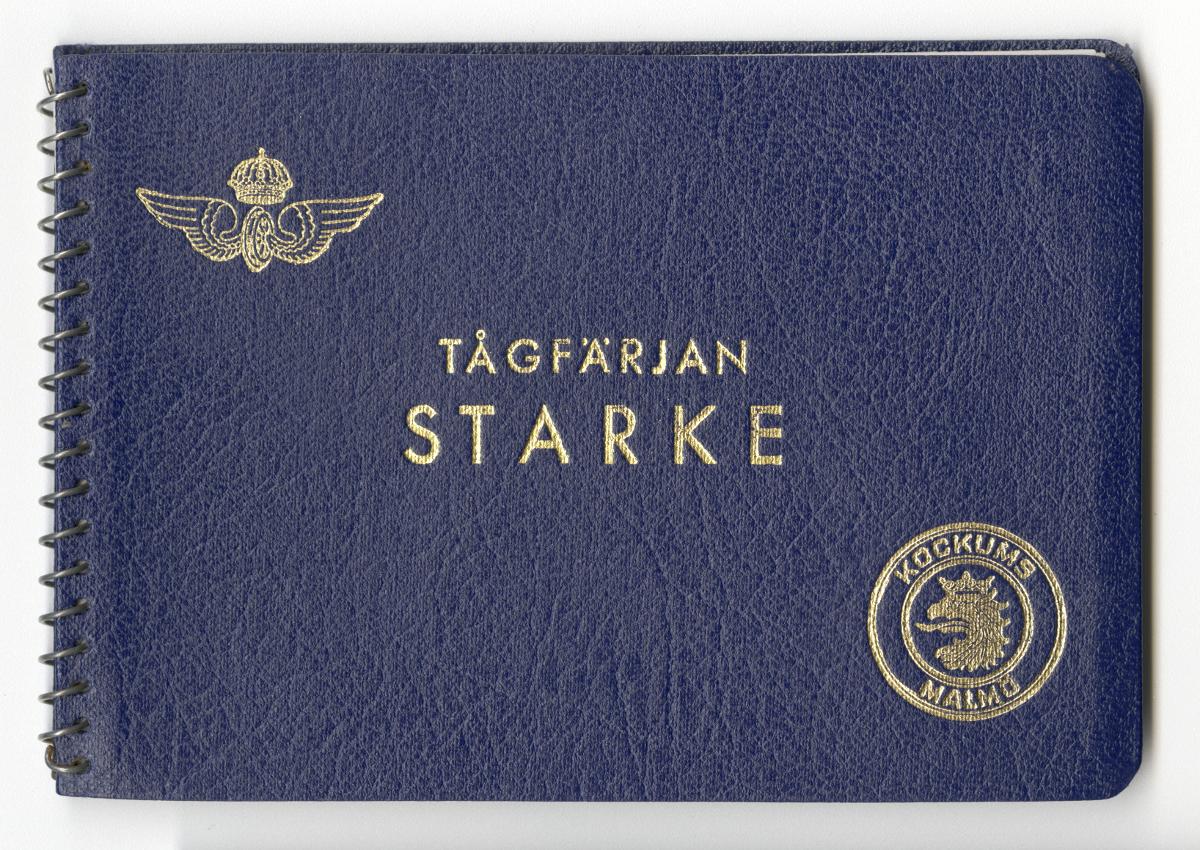- Fotoalbum med fotografier föreställande tågfärjan Starke, dess bärgning och förlängning år 1943. Albumet är spiralbundet och pärmarna av blå klot. På frampärmen Statens Järnvägars symbol med det krönta bevingade hjulet, texten Tågfärjan / Starke och Kockums firmasymbol, d v s den krönta gripen och texten Kockums / Malmö.