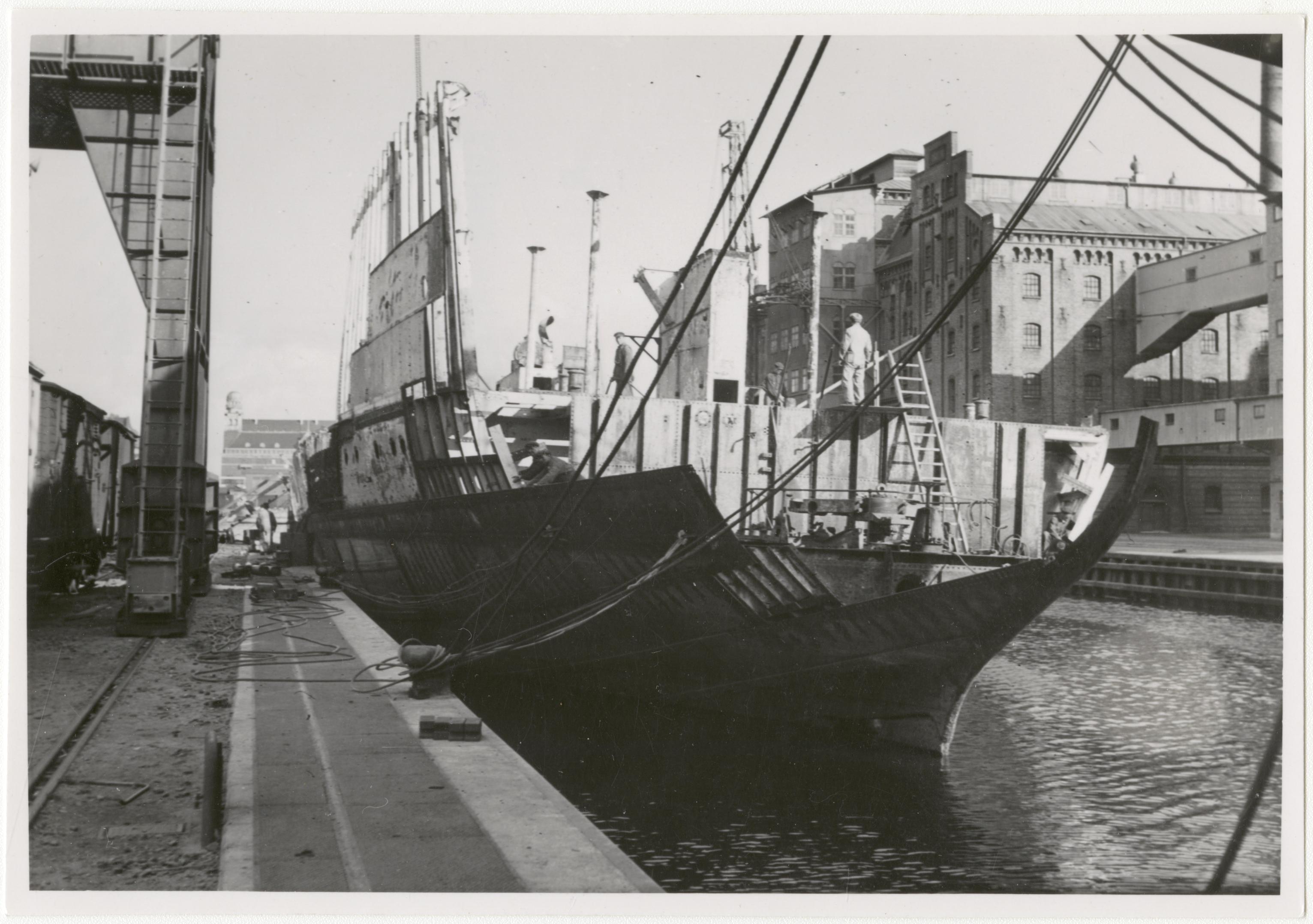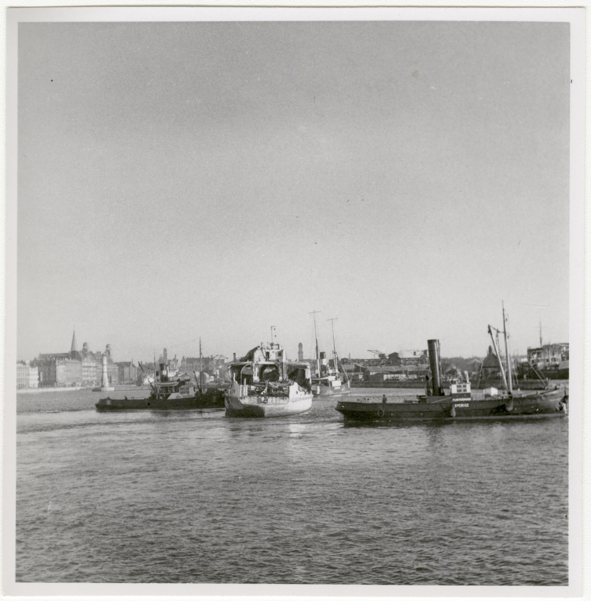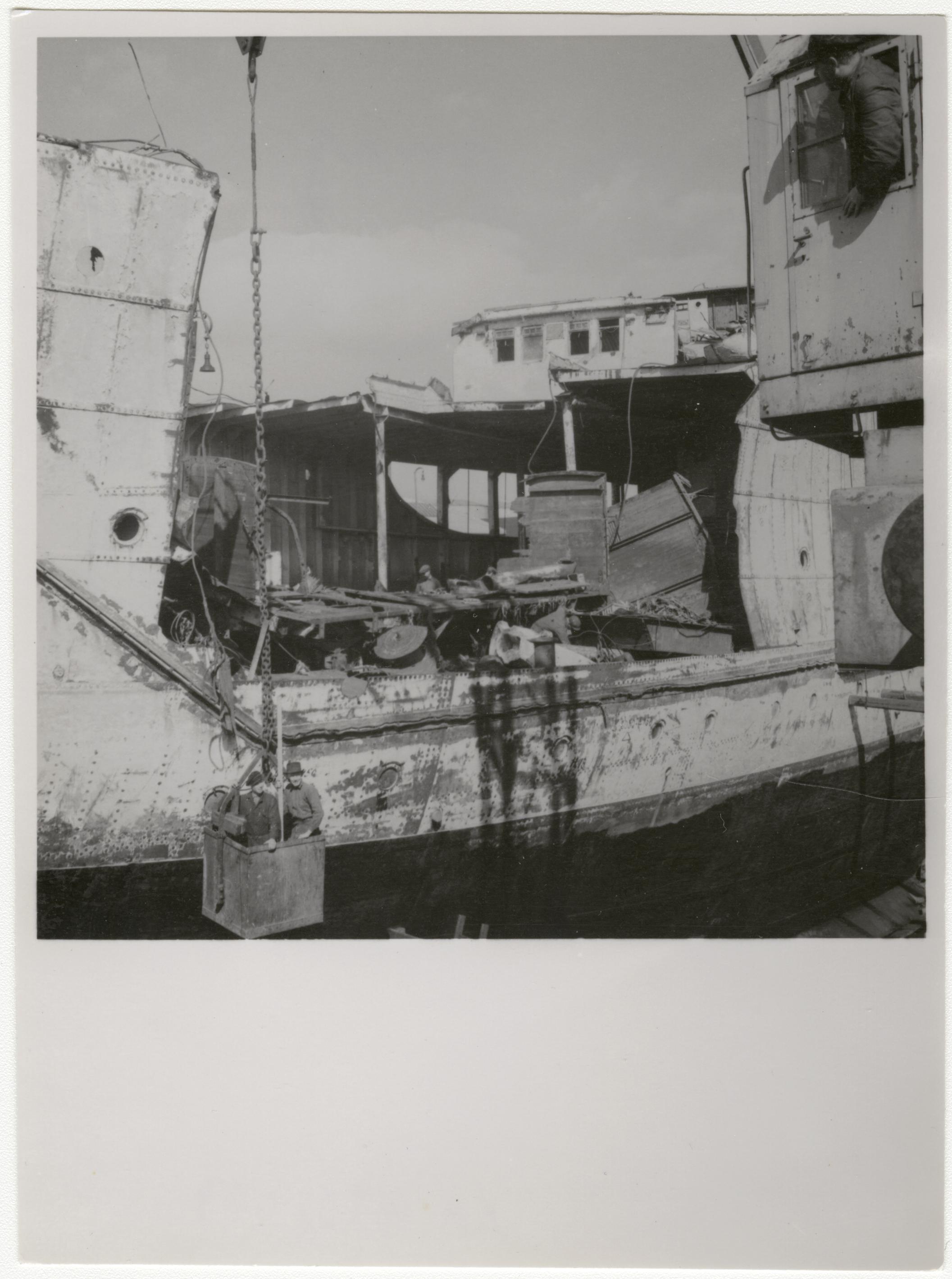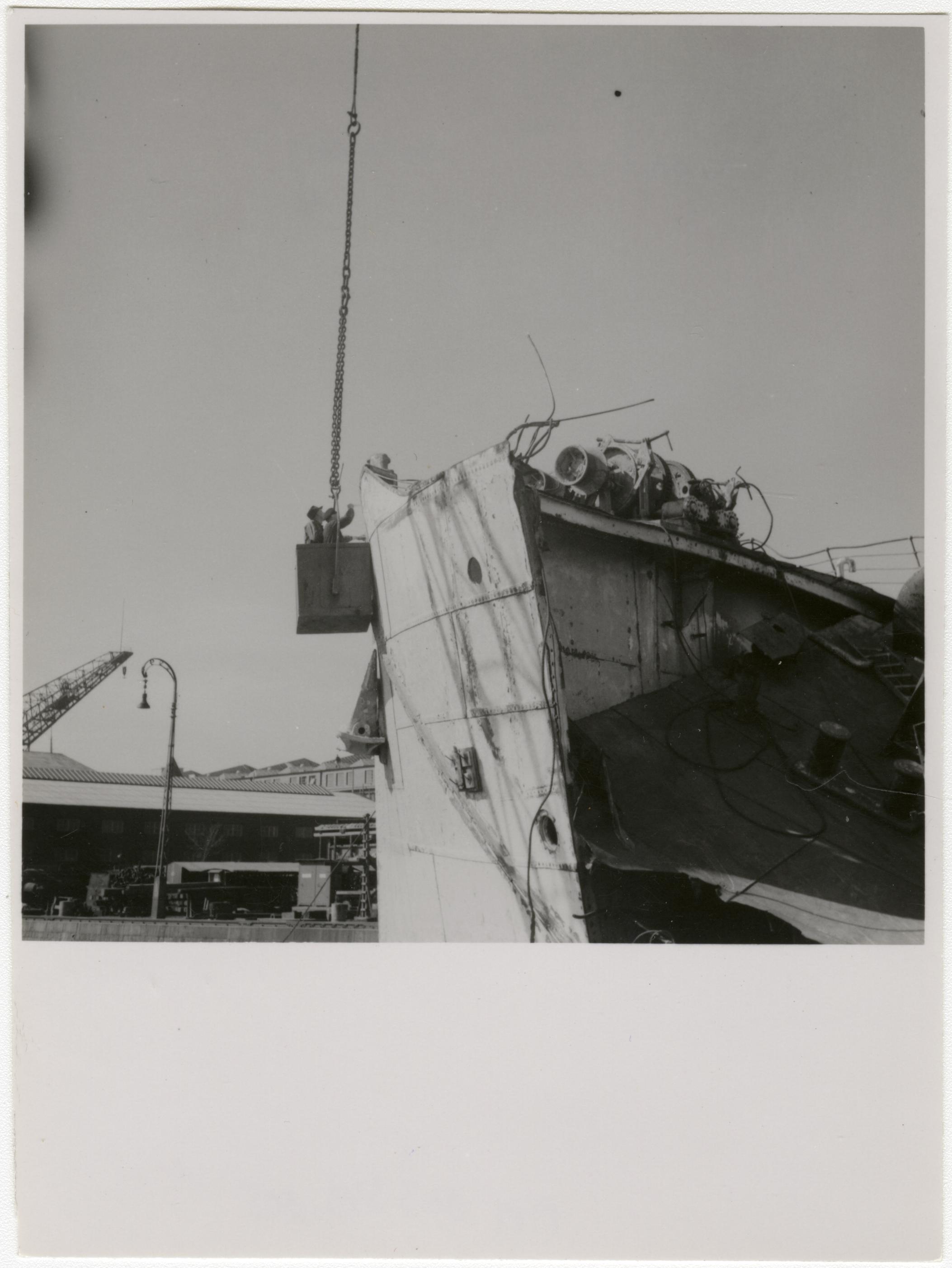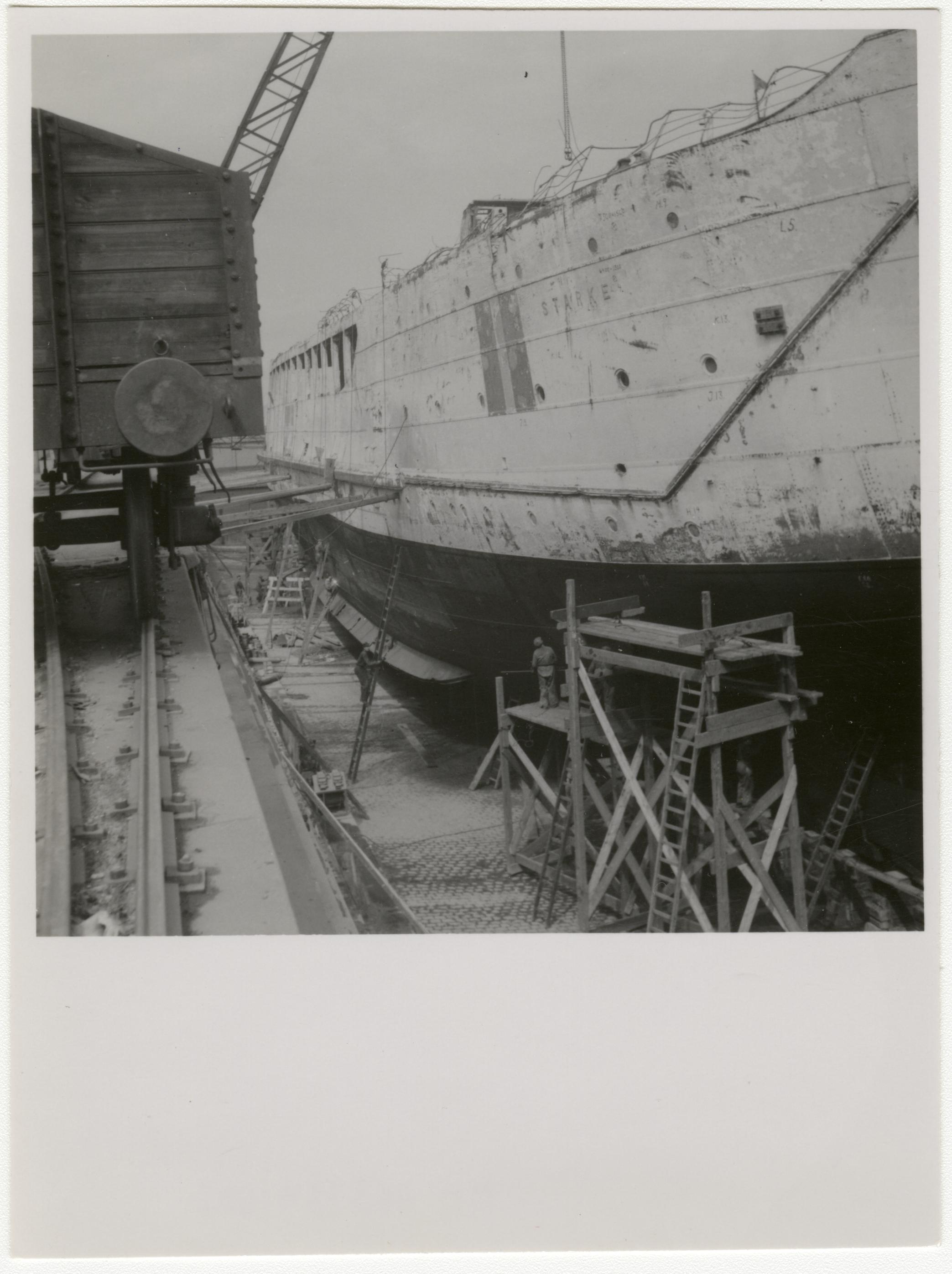 Fotografier, 14, föreställande tågfärjan Starke, dess bärgning och förlängning år 1943.