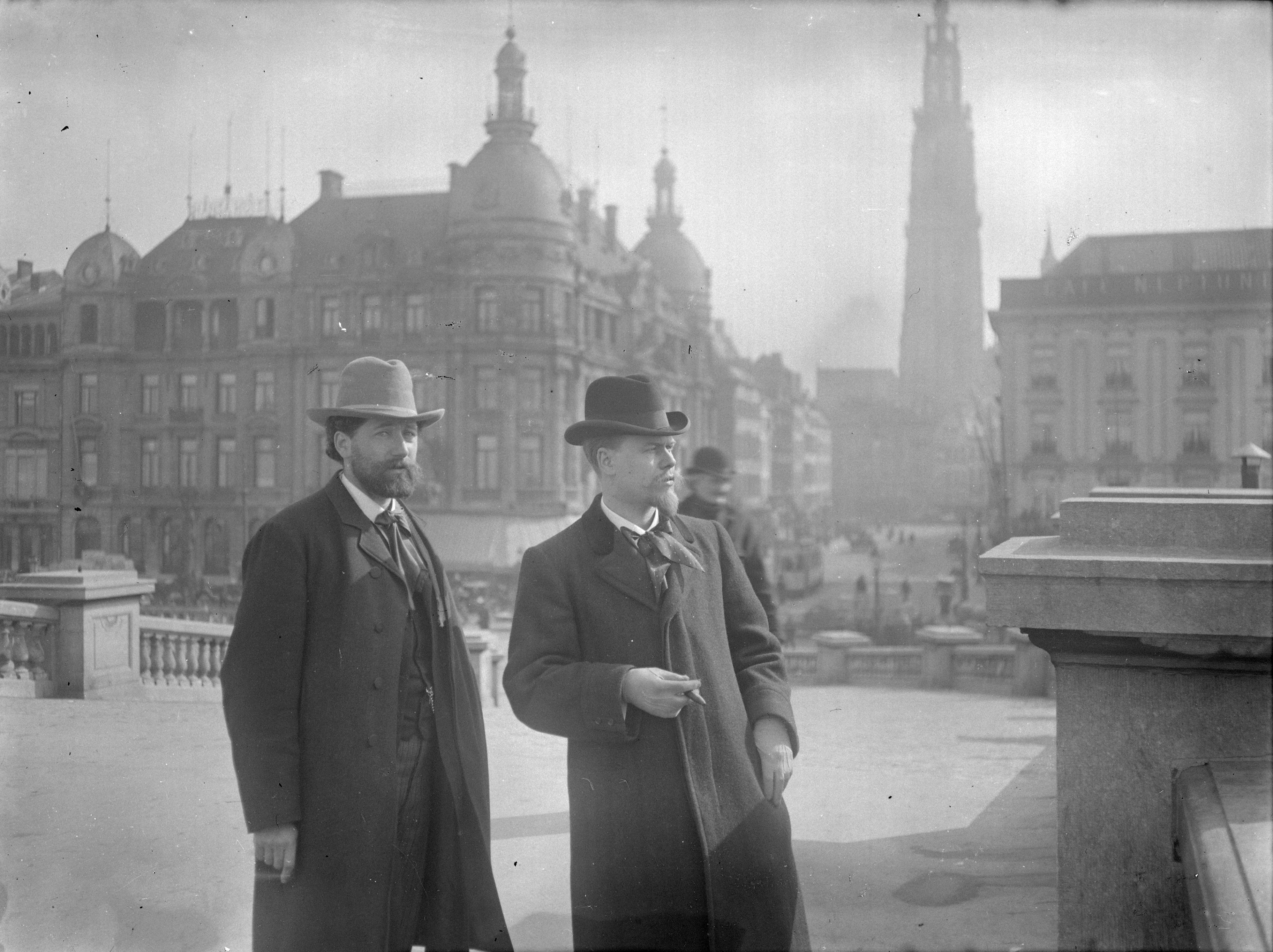 Män i hatt och ytterrock i stadsmiljö.