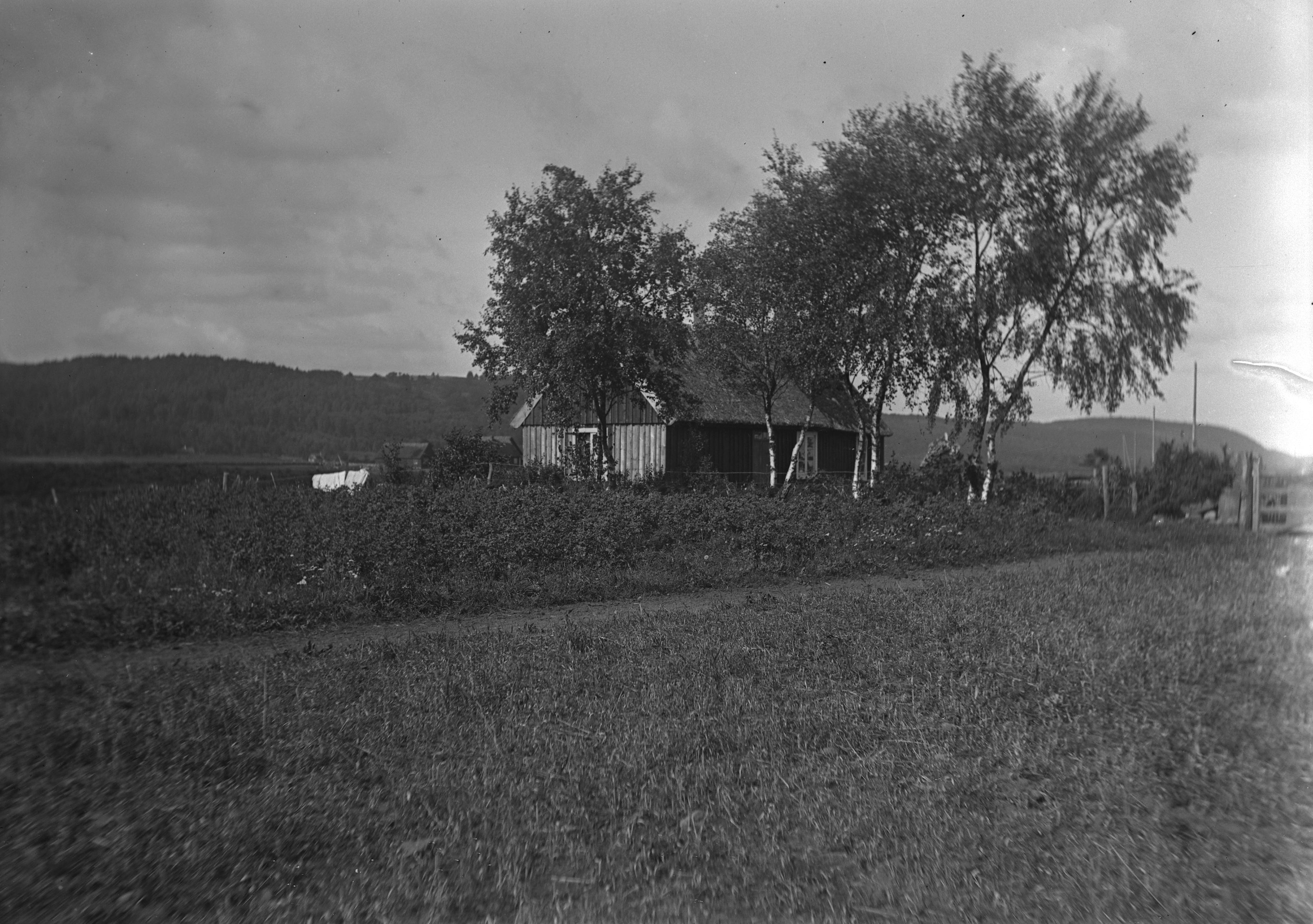 Hus på ett fält med en stig i förgrunden.