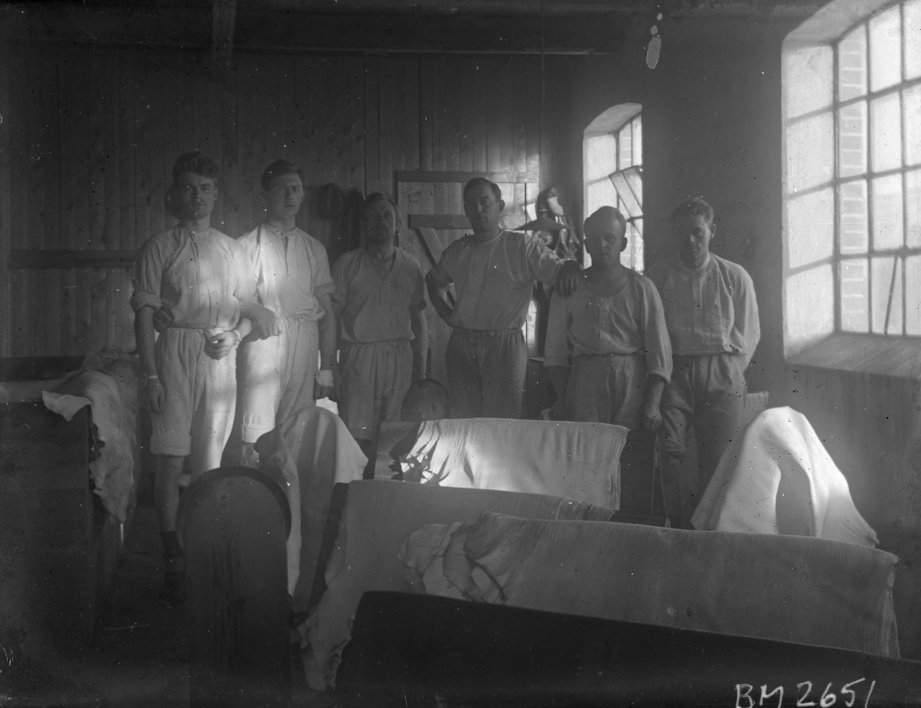 Interiörbild, sex män i rum med vita lakan.