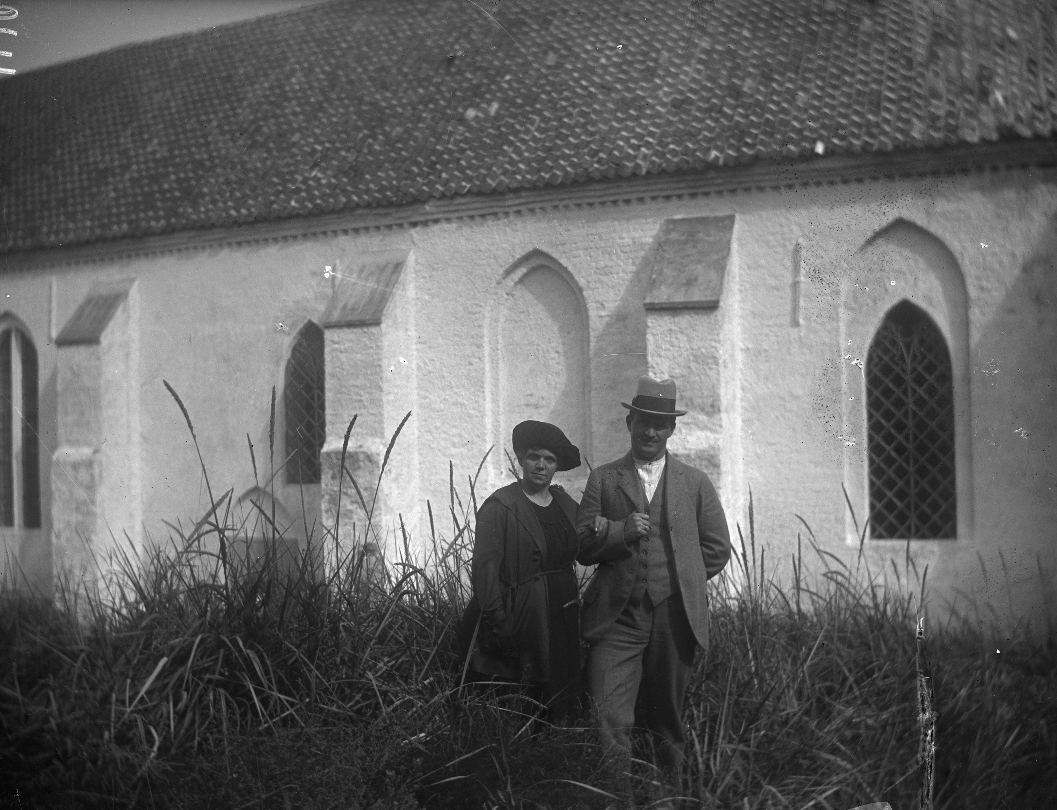 Par framför kyrka i högt gräs.