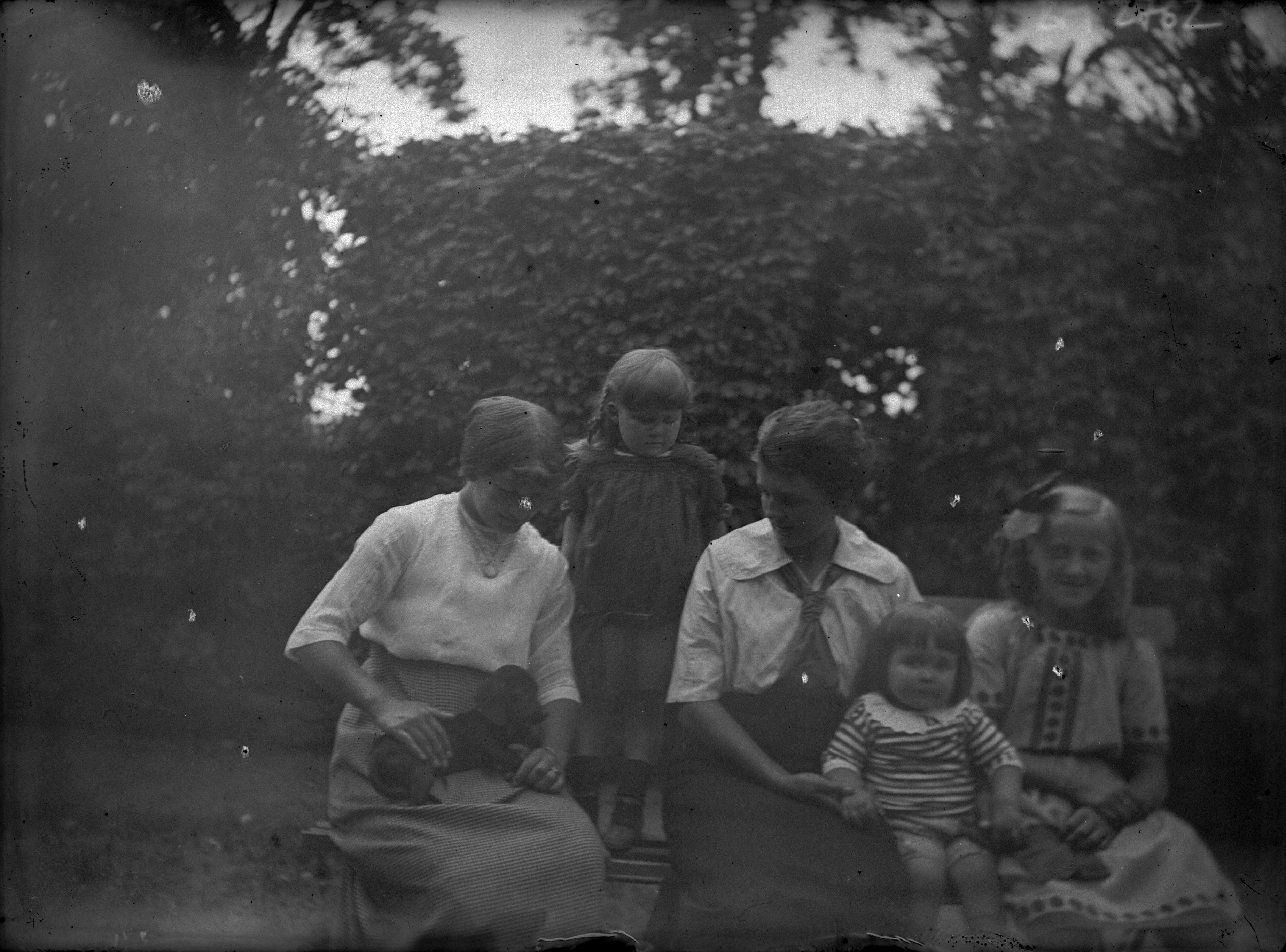 BM 002762 :: barn, hundvalp, hundvalpar, kvinna, kvinnor, trädgårdar, trädgård