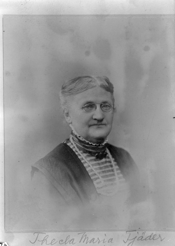 Porträttbild, äldre kvinna med glasögon, Thekla Maria Tjäder.