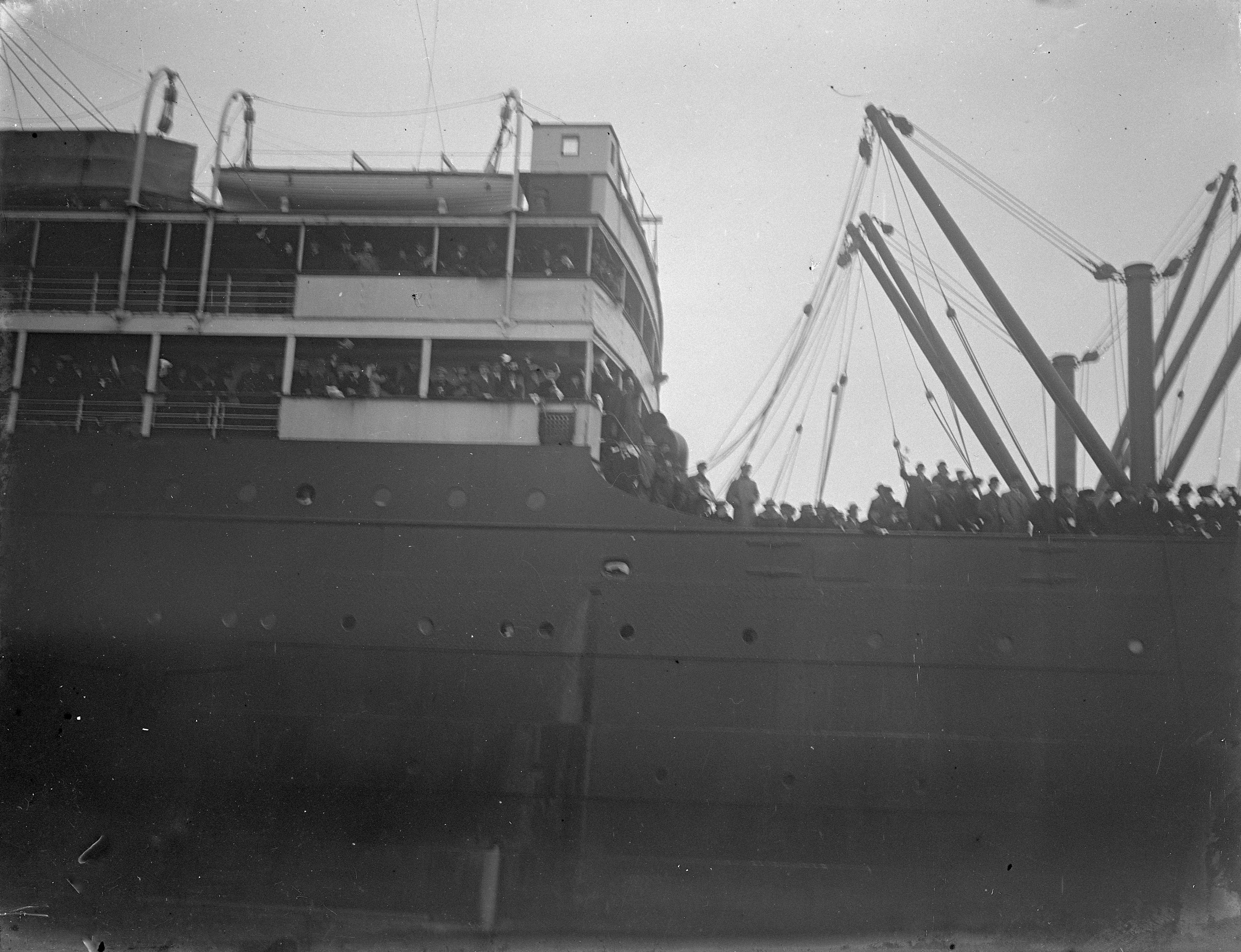 Människor längs relingen på ett stort fatryg.