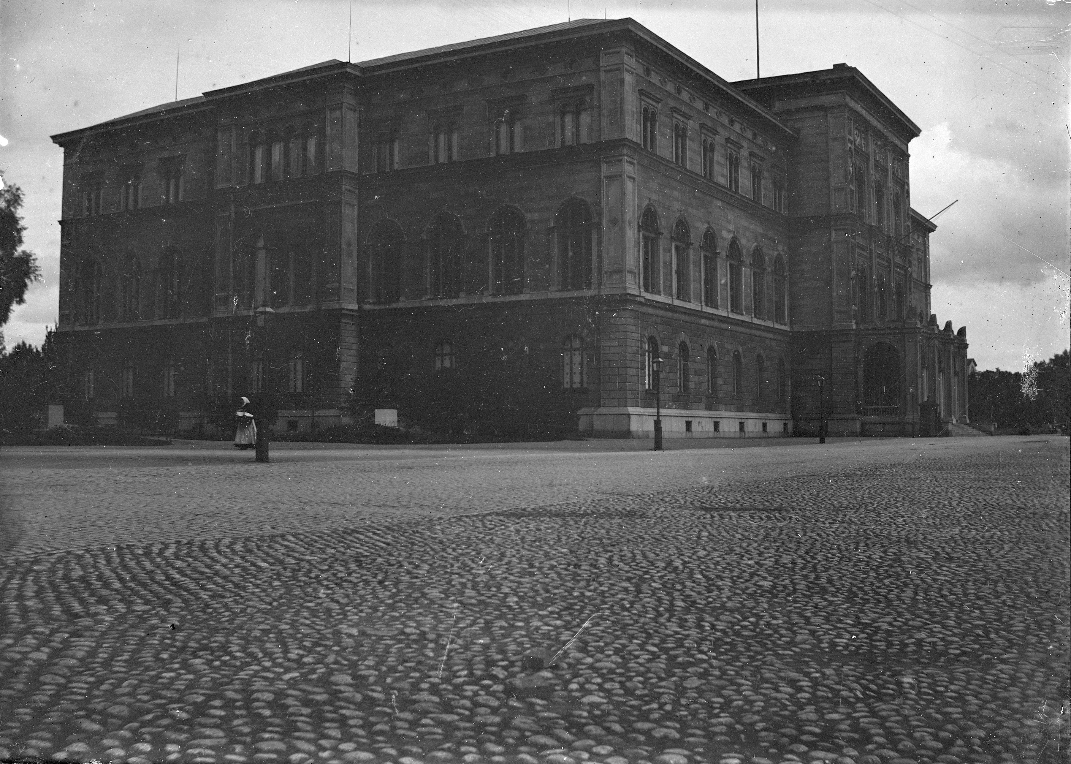Byggnad på kullerstenstorg i stadsmiljö.