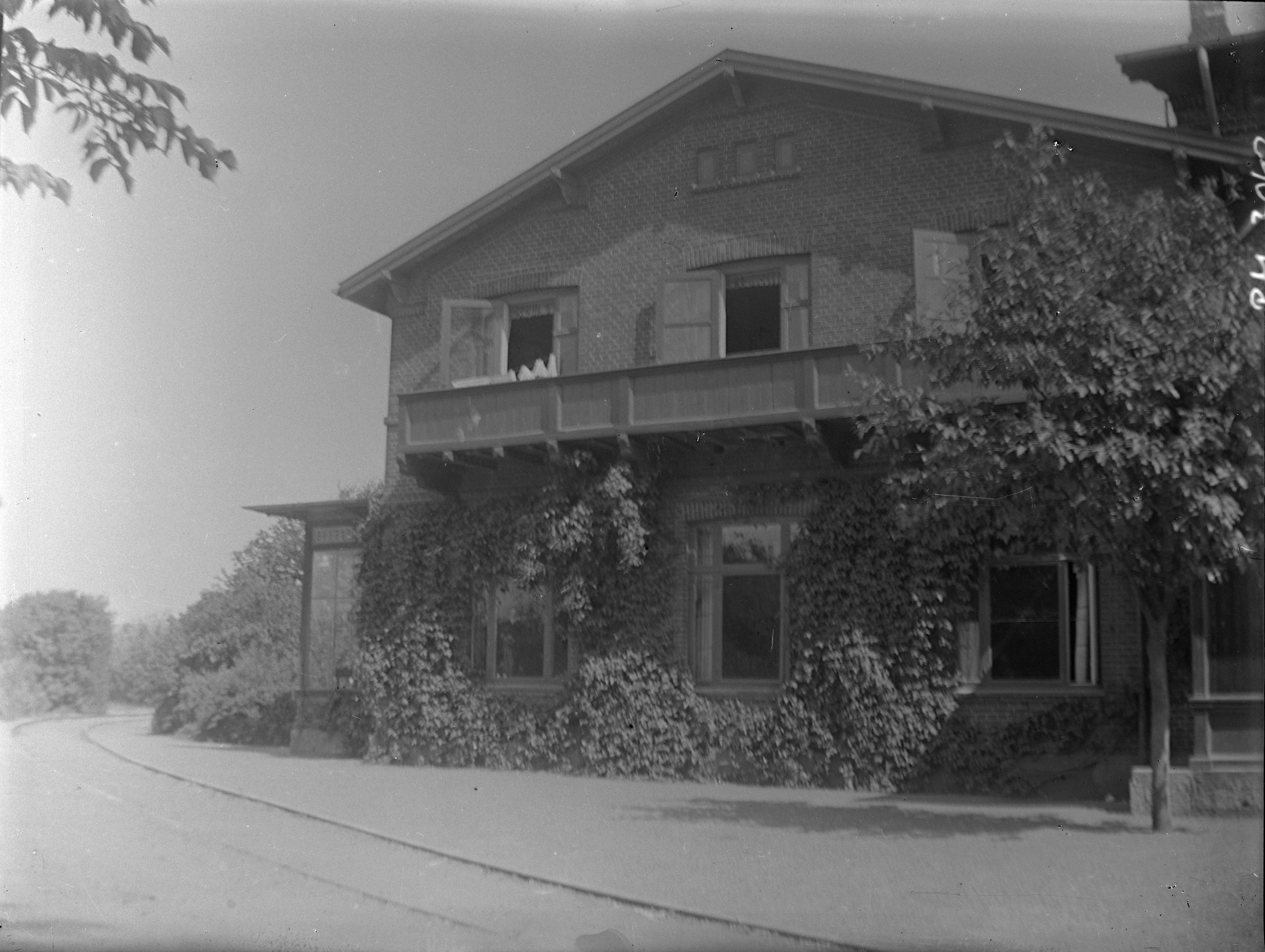 BM 003042 :: balkong, balkonger, murgröna, järnvägsspår, tegelhus