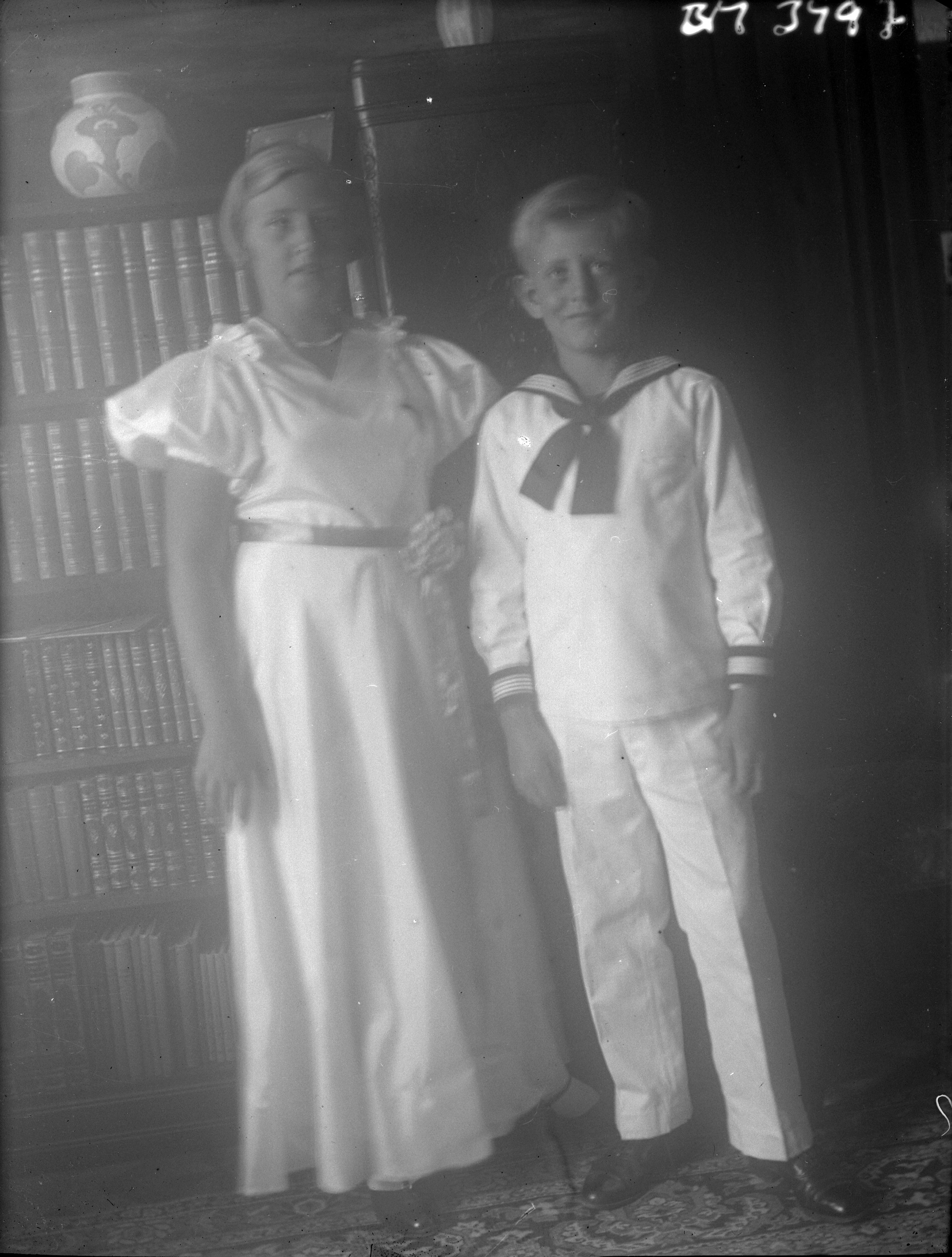 Interiörbild, en flicka och en pojke i ljusa finkläder.