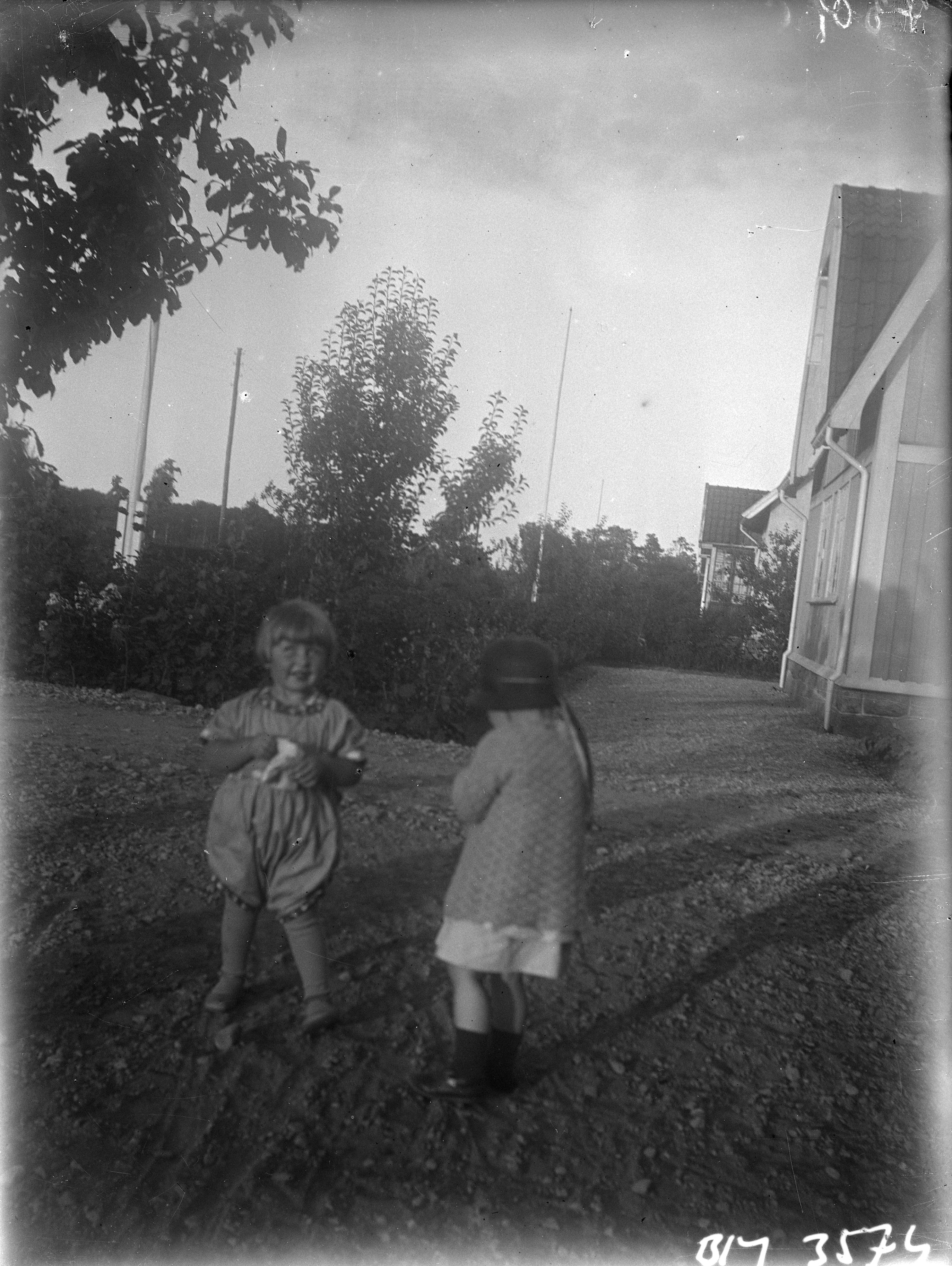 Två flickor på grusgången vid huset.