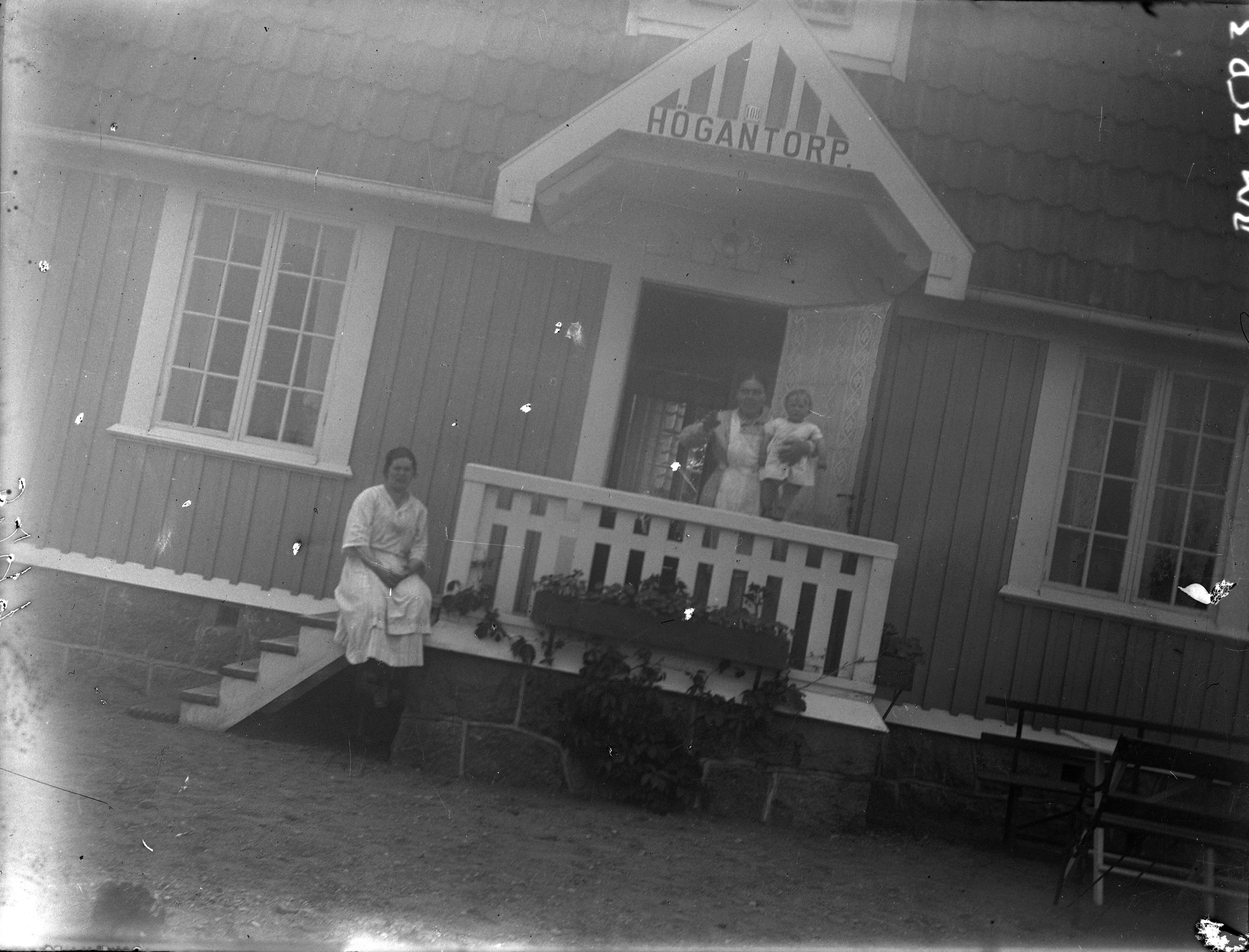 Två kvinnor och ett barn på trappan till huset, Högantorp.