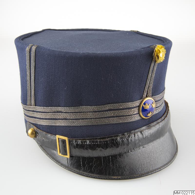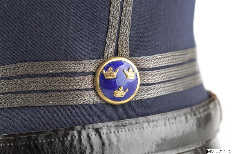 Blåemaljerad mössknapp m/1865. Gul sidenkokard.