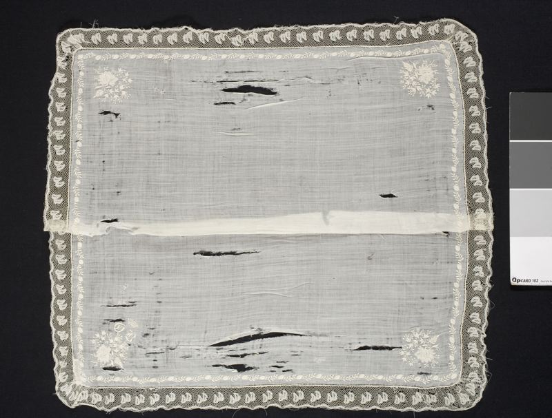 Näsduk, vitt linne med broderier i vitt, kantad av knypplad vit spets.