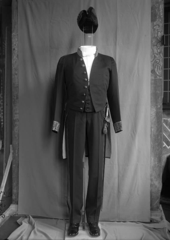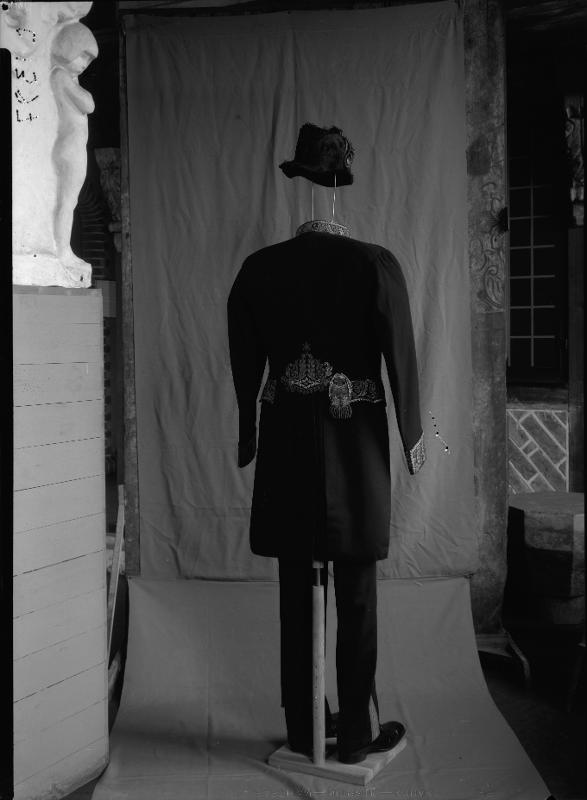 1) Frack av svart kläde, guldbroderad ståkrage, ärmuppslag och ficklock.
