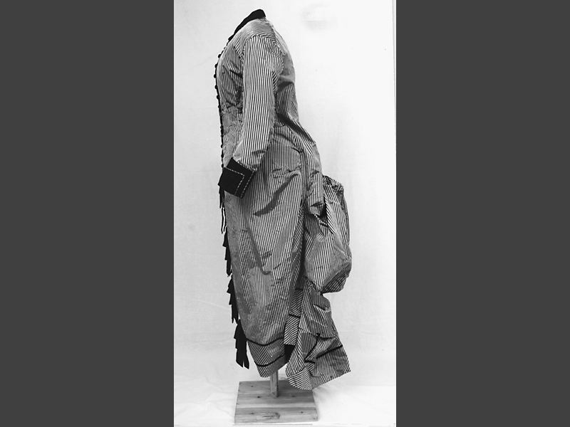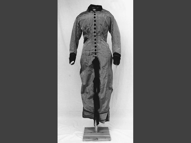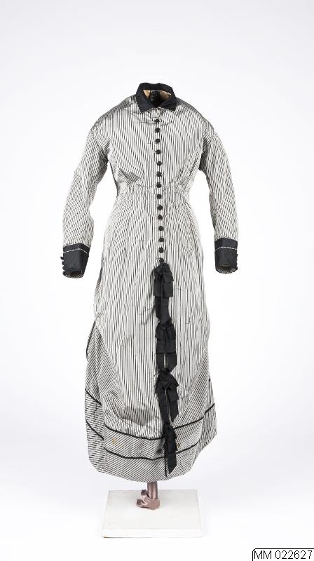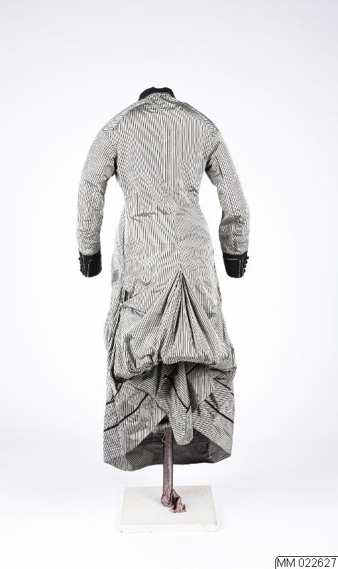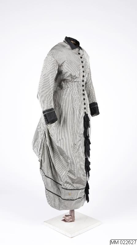 - Klänningsöverdel av grå- och svartrandig siden. Livet figursytt. Långa ärmar med manschetter av svart siden med smala uppvik kantade med klänningens tyg och som knäppes med svarta knappar. Hög halsringning med snibbkrage av svart siden. Knäppes framtill med knappar; träknappar överklädda med svart siden.