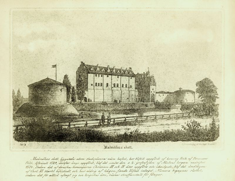 Text under bilden: " Malmöhus slott, liggande utom stadsplanen nära hafvet, har blifvit uppfördt af konung Erik af Pommern 1435. Afbrändt 1529, derefter ånyo uppfördt, blef det under den s.k. grefvefejden af Malmö borgare nedrifvet 1534. Sedan det af danska konungarne Christian III och IV åter uppförts och utvidgats, blef det ändtligen af Carl XI starkt befästadt och har aldrig af någon fiende blifvit intaget. Numera begagnas slottet, sedan det för alltid afsagt sig sin krigiska ära, såsom straffanstalt för fångar.