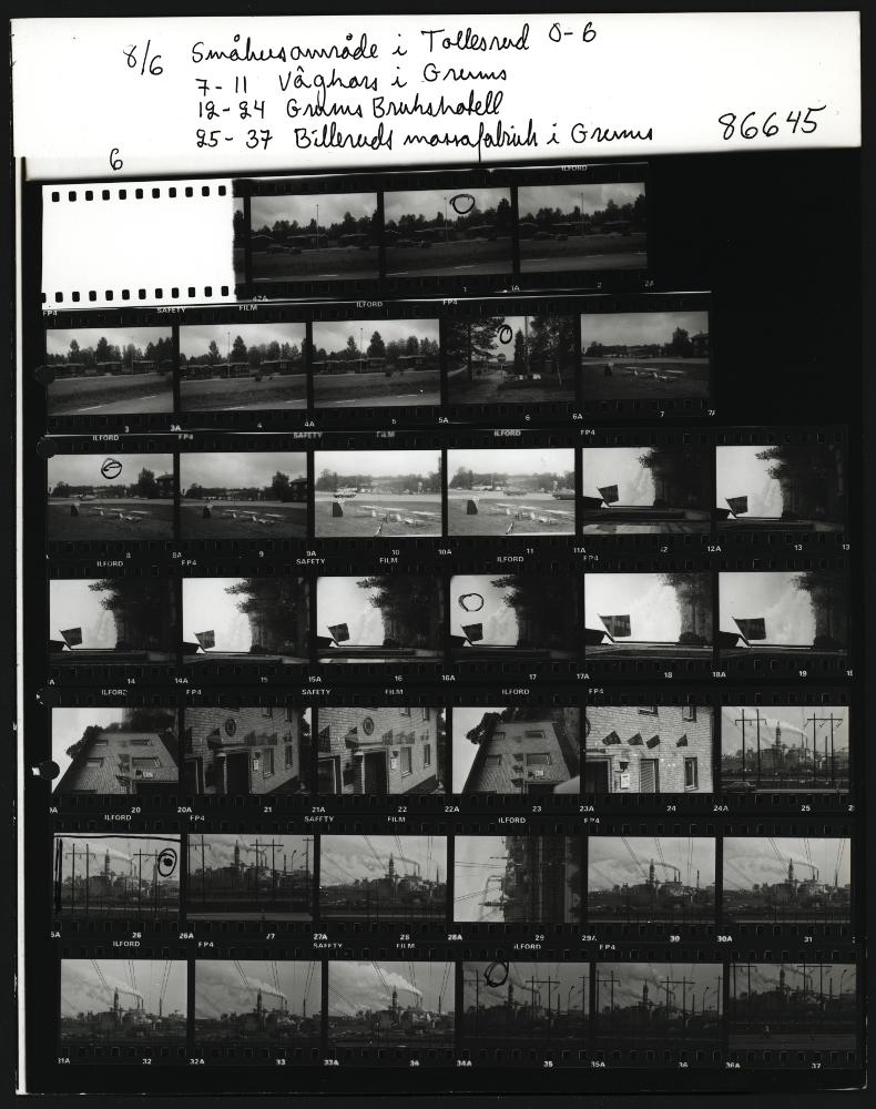 Småhusområde i Tollesrud. Vägkors och Brukshotellet i Grums. Billeruds massafabrik i Grums.