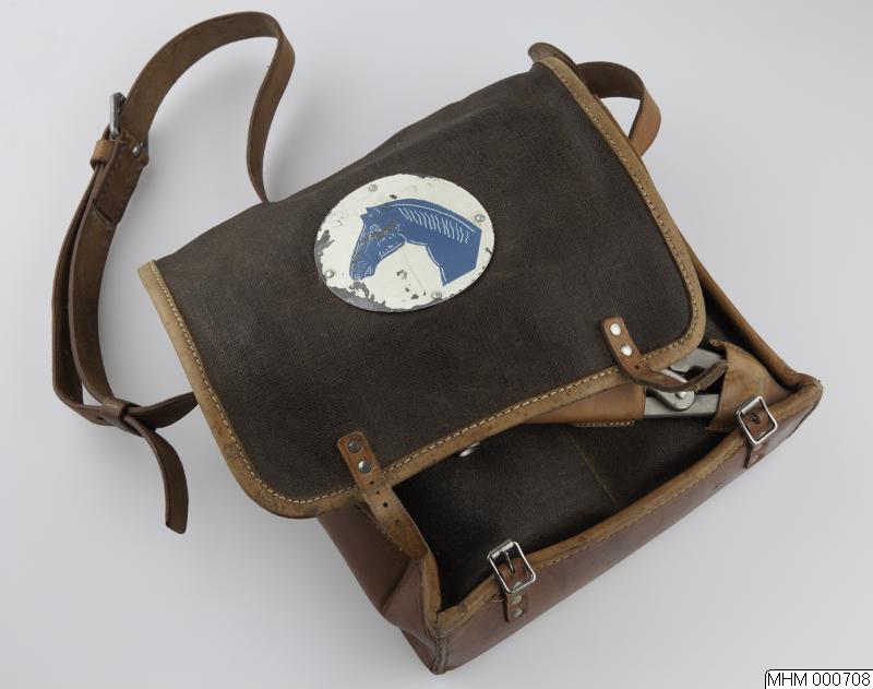 Veterinärväska (axelväska) (samma som MHM 707) med innehåll. Av segelduk och läder. Med runt märke av plåt. Motiv: blått hästhuvud mot vit bakgrund. Till innehållet hör: