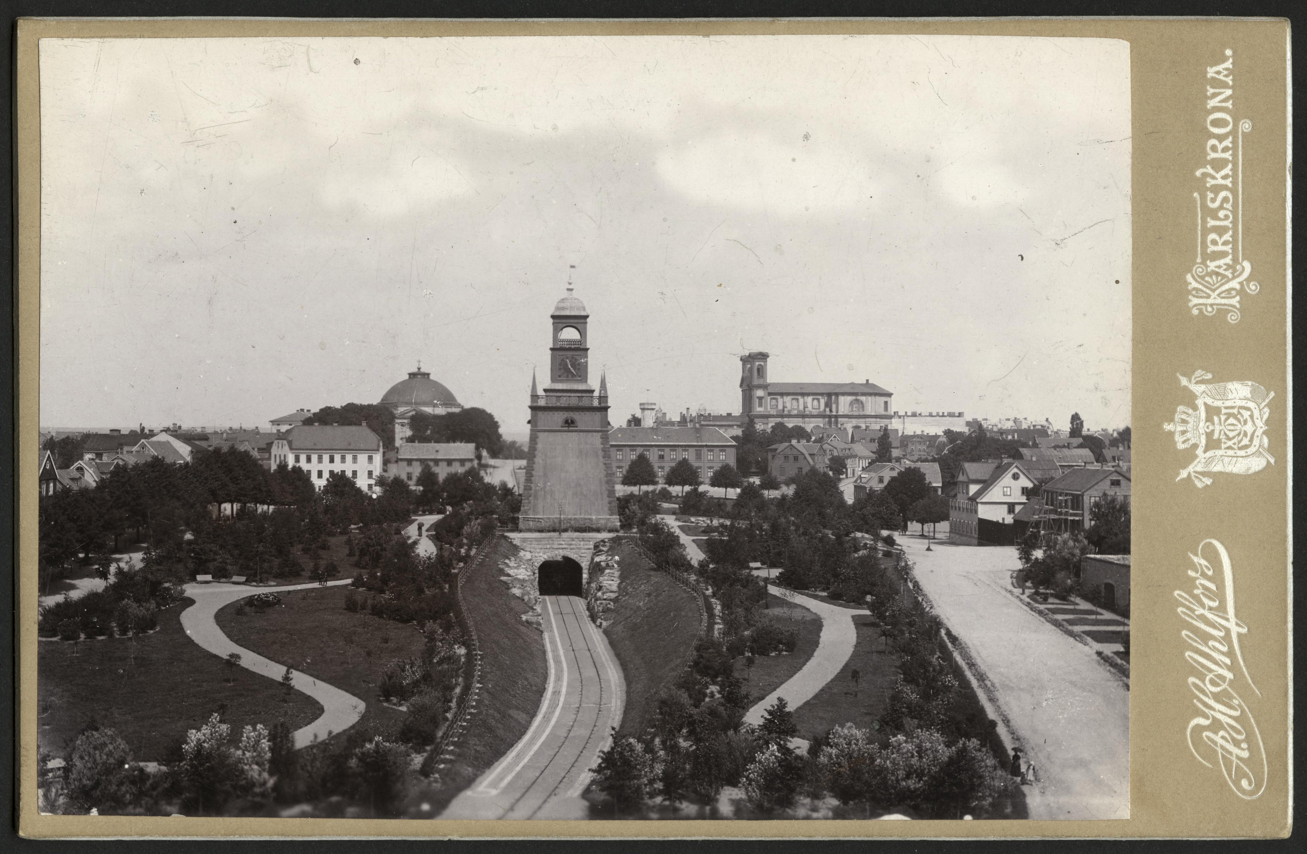 Vy över Karlskrona. Klockstapeln. I bakgrunden syns Tyska kyrkan och Fredrikskyrkan.
